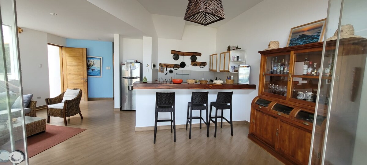 Genieße einen privaten und charmanten Raum, nur 3 Minuten vom Zentrum von Máncora und 200 Meter vom Strand entfernt. Dieses Haus ist der perfekte Ort für Reisende und einen ruhigen Urlaub zu zweit, mit der Familie oder Freunden. Entspanne dich mit dem Rauschen der Wellen und genieße einen spektakulären Blick auf das Meer aus dem Komfort deines Zuhauses fern von zu Hause. (2. Stock)
