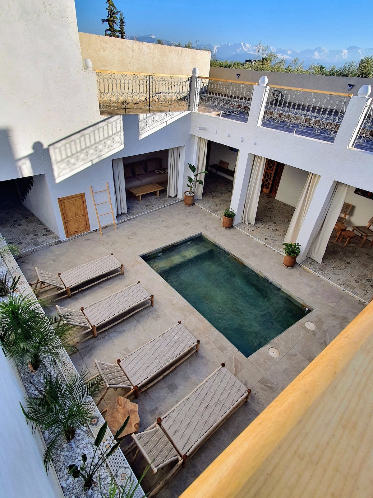 Nur 45 Minuten vom pulsierenden Herzen von Marrakesch entfernt liegt Ourika – ein üppig grünes Tal, in dem die Berge auf den Fluss treffen. Die Landschaft ist lebendig mit terrassierten Gärten, glitzerndem Wasser und frischer Bergluft. Hier in der Villa Ourika sind Sie eingeladen, langsamer zu werden, den Moment zu genießen und sich mit dem marokkanischen Leben zu verbinden. Ob es darum geht, an einem traditionellen Kochkurs mit frischen Produkten aus unseren Gärten teilzunehmen oder einfach nur am Pool zu entspannen, jedes Detail ist darauf ausgelegt, dich in den Rhythmus des Tals einzutauchen.