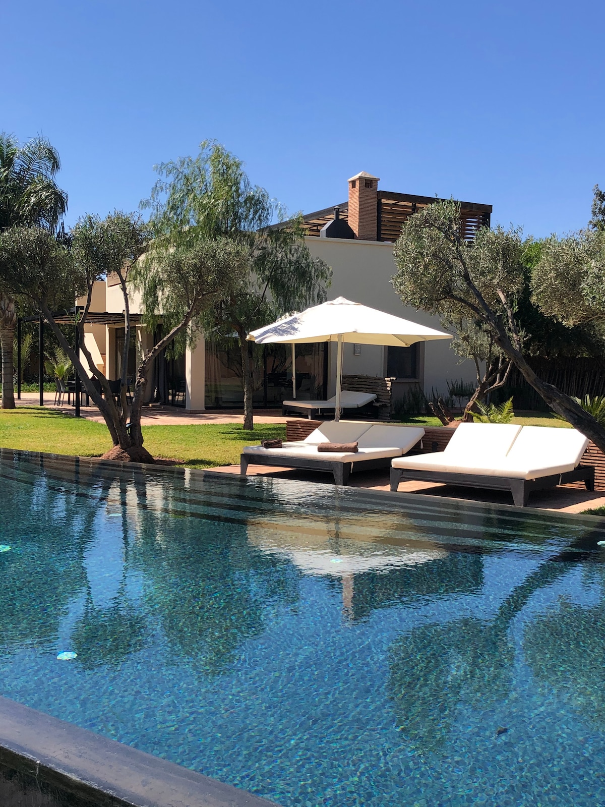 Discover the magic of Marrakech from this stunning 5-suites villa, featuring, a spectacular heated glass pool, and a cozy fire pit perfect for evening gatherings. Every suite is designed with modern elegance and ultimate comfort in mind, offering privacy and style for families or groups. Enjoy our full staff service, for a seamless, stress-free stay. Set in a serene, beautifully landscaped setting, this villa combines contemporary luxury with Moroccan charm, creating an unforgettable retreat