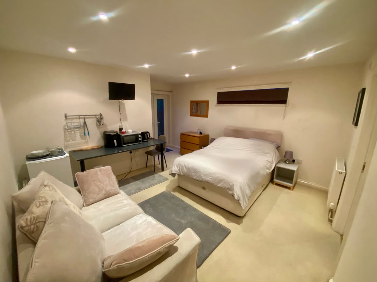 The Garden House is a lovely single room annex with independent access, en-suite bathroom and shower. Light, cosy, and simply furnished, set in the garden of a residential home near the centre of Gloucester, it's a quiet space to relax or work. Driveway parking available. A two-minute walk to the famous Kingsholm rugby stadium and food shops, ten minutes to city centre, bus and train stations, cathedral, Quays shopping outlet, restaurants and historic docks. Easy bus route to Cheltenham.