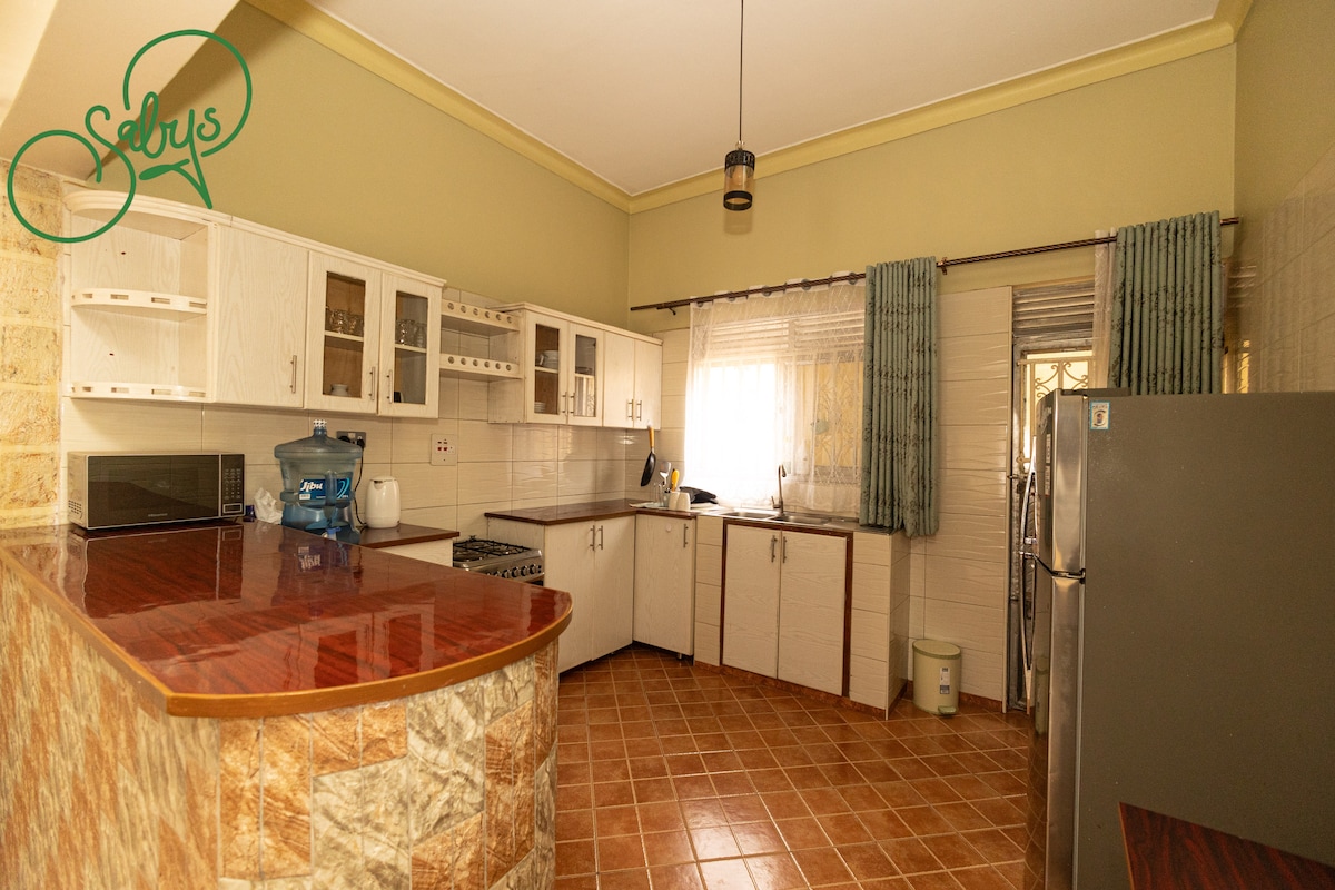 Salys Place is a peaceful 4- bedroom, 4 bath home located in Central Mbarara. Extra baby-bed. Car parking of up to 4 cars. High speed internet. Kitchen fitted with gas cooker, fridge, microwave oven for your cooking. Sitting room with TV connected to Dstv. Washing machine. Outside barbeque area. Very secure. Just 3km from Mbarara Central Market (Mbarara city center) in Kakoba Division. Relax with the whole family at this peaceful place to stay. There is a full time caretaker to assist you.