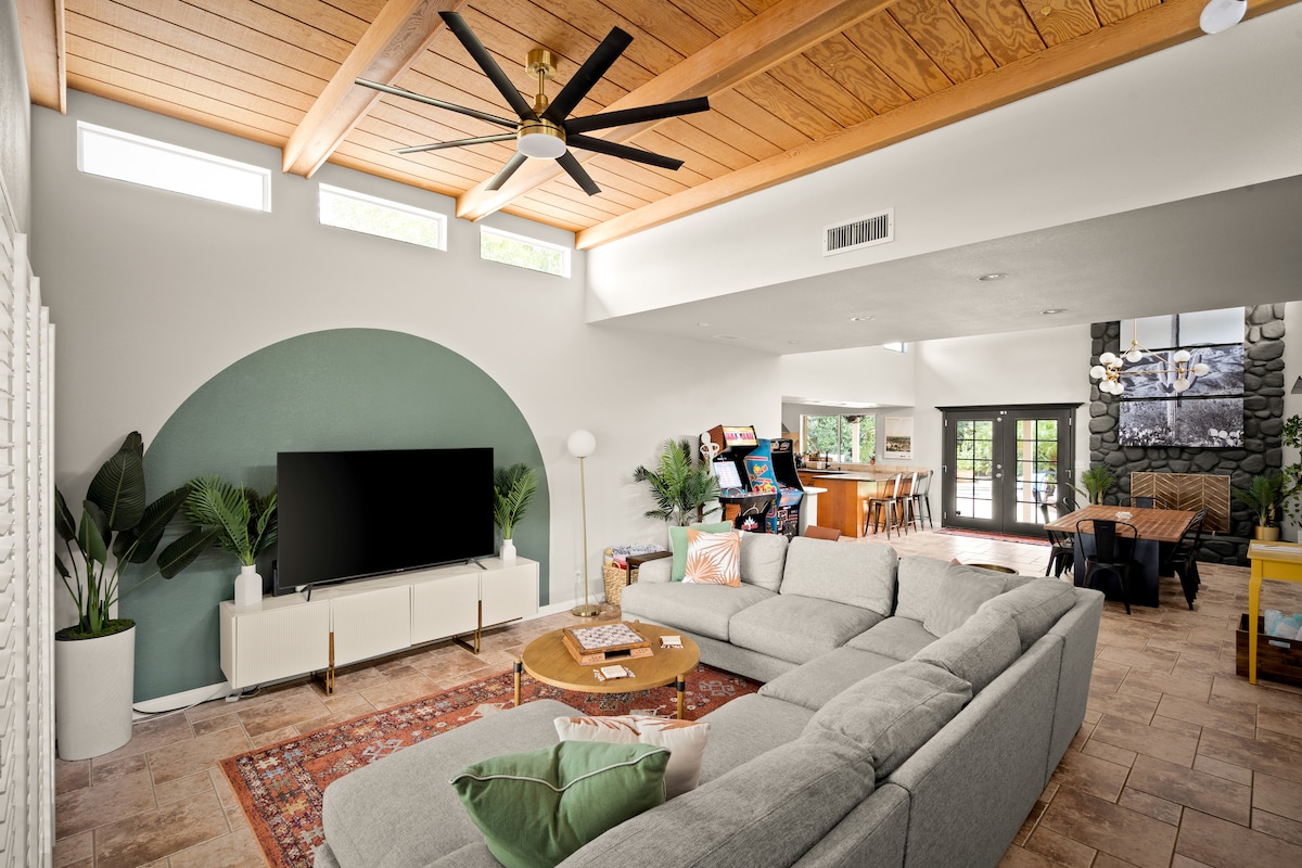 Willkommen in der versteckten Hacienda Scottsdale! Ein lustiger, skurriler Rückzugsort mit Cowboy-Chic-Dekor, Pool, Spa, Karaoke und Spielen - perfekt für Junggesellinnen, Familien oder Golfurlaube. Schlafmöglichkeiten für 10 Personen mit bequemen Betten, Smart-TVs, einem Billardtisch und einer voll ausgestatteten Küche. Entspannen Sie sich unter schaukelnden Palmen, üben Sie Ihren Schwung auf dem Mini-Putting-Green oder entspannen Sie sich in Ihrer privaten Hinterhof-Oase mit gemütlicher Sitzfeuerstelle und Außenfernseher. Nur wenige Minuten von Kierland Commons, den besten Golfplätzen, dem Frühjahrstraining und vielem mehr entfernt!