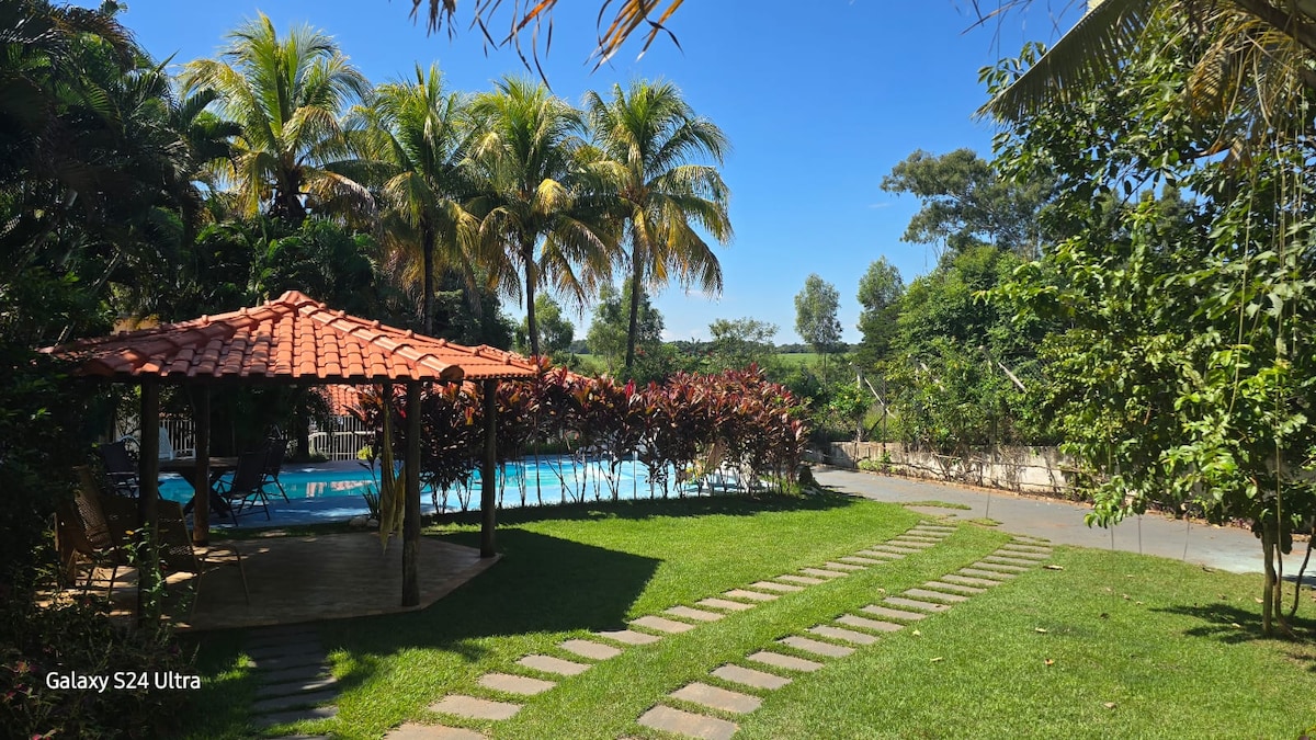 Nosso rancho fica em condomínio fechado com segurança 24 horas. temos 5 quartos para 16 pessoas confortavelmente, todos os quartos tem ar condicionado. Temos uma sala de tv, e cozinha com ar condicionado, área gourmet com churrasqueira, cervejeira e ar condicionado. Piscina aquecida, mirante em cima dos quartos com visão ampla. Com tudo, fogão, geladeira, copos, utensílios de cozinha, temos uma quadra de vôlei, lareira externa e o condômino tem pear de pesca