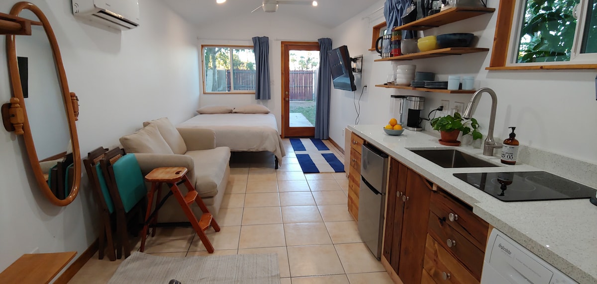 Dieses gemütliche 160sf kleine Haus/Gästehaus wird sicherlich unvergesslich sein. Genieße diese sehr private Umgebung nur wenige Schritte vom Pool entfernt, der für deine Nutzung verfügbar ist. Das Schlafsofa lässt sich ausziehen und bietet Platz für bis zu zwei Erwachsene. Privates Badezimmer mit WC und heißer Dusche nur für dich. Die Küchenzeile verfügt über einen Minikühlschrank, eine Mikrowelle und eine Kaffeekanne. WLAN und TV mit Streaming-Abonnements und Heizung/Klimaanlage.