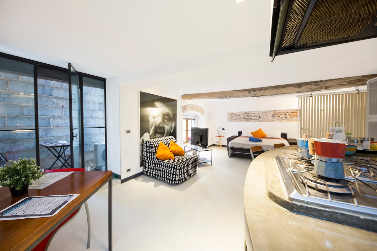 On the top floor of late nineteenth century building, with a large cozy terrace ideal in any season, sunbathe, have lunch outdoors among the plants, in the shade of the gazebo. Loft furnished in an original way, reflects the modern and romantic taste of the hosts, with all the comforts for both business and for families with children. Our neighborhood, in the very center, will enchant you for its restaurants, peacefulness. Very close to the sea and to the historic center.