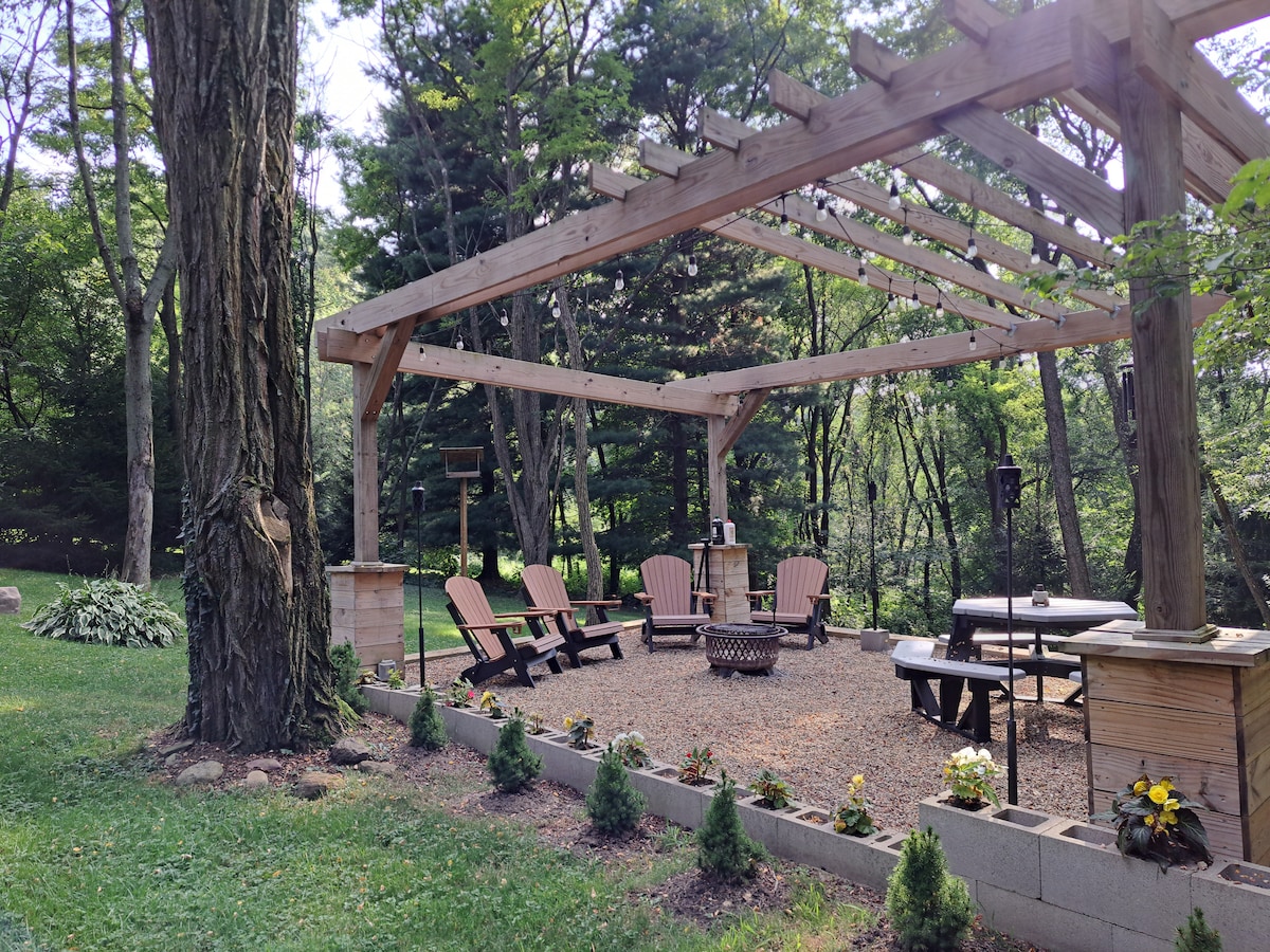 Ein schönes Blockhaus in Berlin Ohio, dem Herzen von Amish Country. Eingebettet neben einem 8-Acre-Teich mit einem offenen Dock und Adirondack-Stühlen. Die Natur bietet andere Entspannungsmöglichkeiten wie das Baden im Whirlpool, das Putten auf dem Putting-Green, das Sitzen unter der Pergola mit der Gasfeuerstelle, das Schaukeln auf der Veranda oder das Grillen auf der Terrasse. Oder du kannst ins Haus gehen und dich auf dem Massagesessel entspannen, ein Spiel spielen oder dir etwas auf einem der 4 Fernseher ansehen oder einfach ein Nickerchen machen.