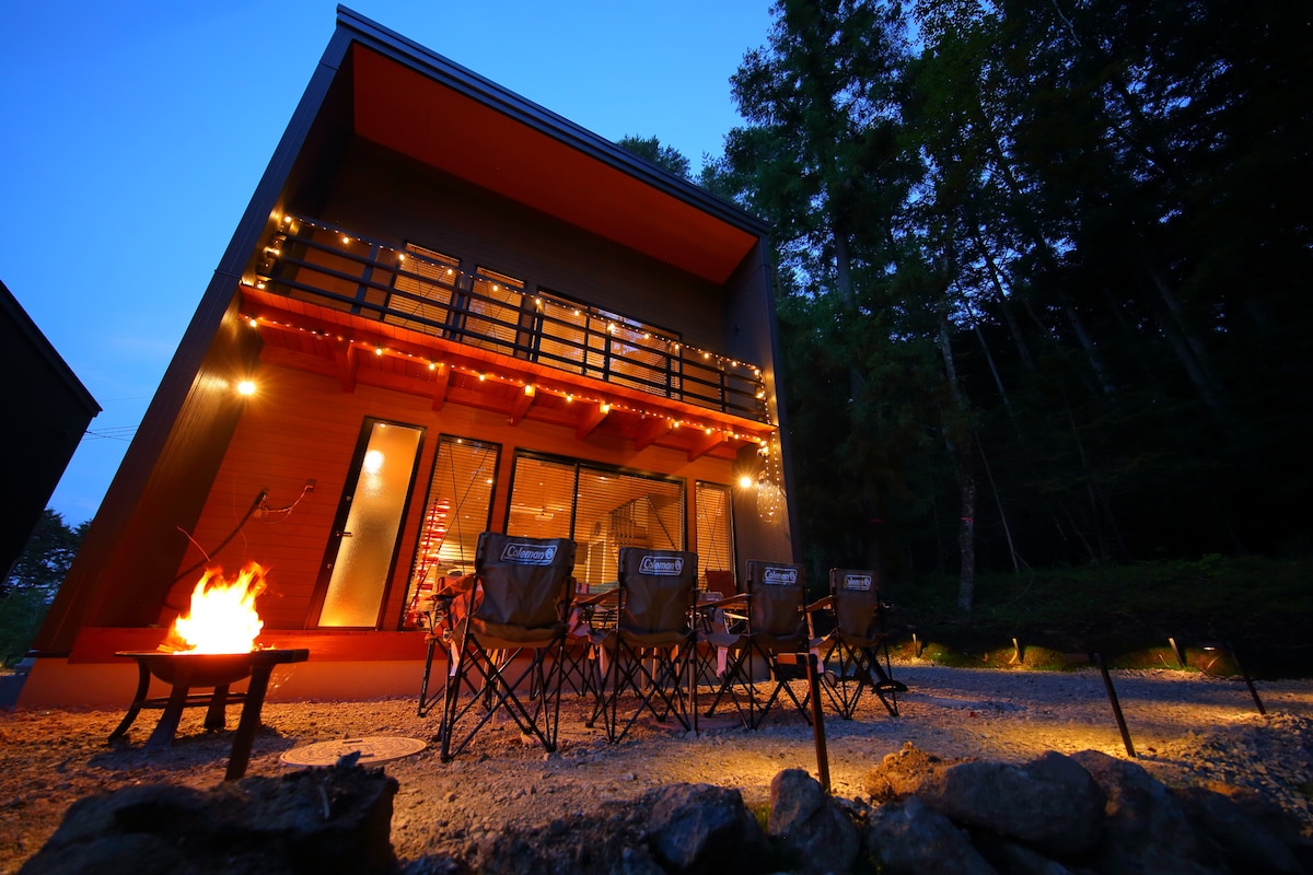 Diese Unterkunft ist auf eine Gruppe pro Tag namens „Private Resort Fuji“ in einem Villenbereich 11 Gehminuten vom Yamanaka-See entfernt beschränkt, der im Juli 2024 von einem Designer renoviert wurde. Es ist ein japanisches modernes Designhaus, das auf einer Gesamtfläche von 115 ¥ 3LDK-Hütten basiert. Wenn du in den ersten Stock gehst, kannst du den großen Mt. Fuji vom Fenster des Wohnzimmers, Grill auf dem großen Balkon auf der Rückseite des Mt. Fuji, und nachdem du die Fasssauna genossen hast, die von Bäumen umgeben ist, kannst du im Ruhebereich draußen im Wald baden.Der Hof verfügt über eine große Feuerstelle, an der du sogar über das Feuer sprechen kannst.Darüber hinaus gibt es einen hohen Zaun im Garten, wenn du deinen Hund also mitbringst, musst du dir keine Sorgen machen, wegzulaufen. Das Zimmer verfügt über einen großen 90-Zoll-Bildschirm, auf dem du Prime Video, Youtube und mehr genießen kannst.Nachts kannst du auch den Sternenhimmel sehen, wenn die Bedingungen stimmen.