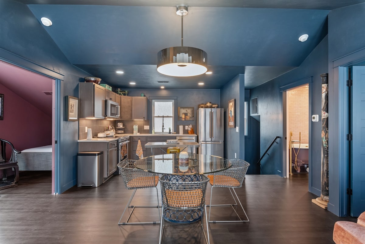 „Ein gut ausgestatteter, gemütlicher und stilvoller Rückzugsort in der Nähe von allem in Kohler.“ – Kim Nimm die Treppe zu meinem abgelegenen Rückzugsort im 2. Stock mit Baumblick! Ein privater Seiteneingang und ein offener Grundriss, flankiert von zwei Schlafzimmern, machen diese Unterkunft perfekt für Paare oder ein Mädchen-Kurzurlaub-Spa-Wochenende. Romantische Akzente der Jahrhundertwende treffen auf modernen Komfort und Bequemlichkeit. In der gesamten Wohnung findest du Baker-Möbel, die zuvor ein Kohler-Unternehmen waren, und deinen Aufenthalt im Village of Kohler verbessern.