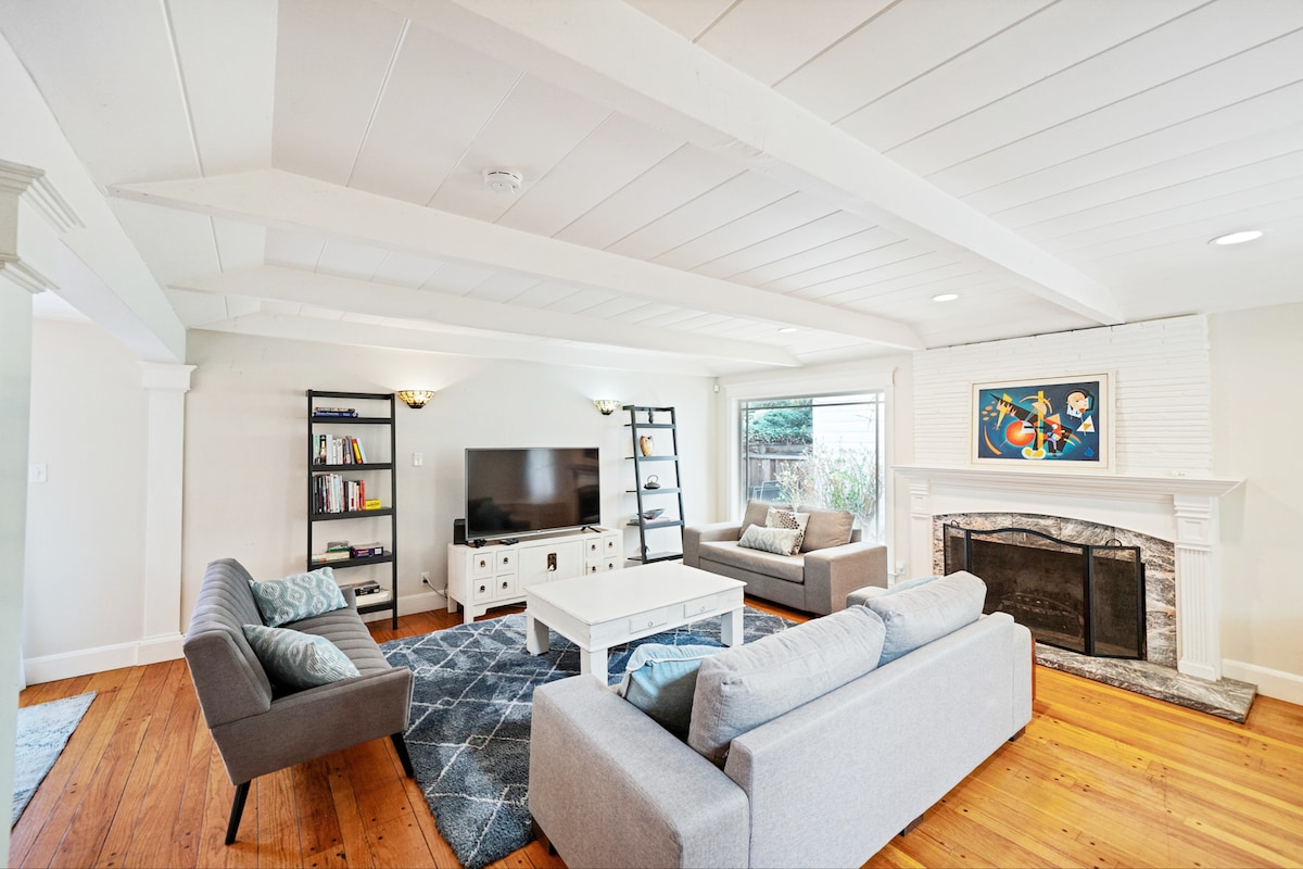 Genieße ein stilvolles Erlebnis in dieser zentral gelegenen Unterkunft! Dieses lichtdurchflutete, moderne Juwel aus der Mitte des Jahrhunderts wurde geschmackvoll mit hochwertigen skandinavischen Möbeln (BoConcept-Sofa, Teppich, Wandelemente) und einem europäischen Eichenboden renoviert. **Mini-Split-Klimaanlage wird im Juli 2023 installiert.** Sie verfügt über einen geräumigen Gemeinschaftsbereich für Familien zum Entspannen, eine voll ausgestattete Küche, 3 Queensize-Betten, 2 Badezimmer und schnelles WLAN (>200 Mbit/s). Go0gle/Stanford ist eine 5 ~ 10-minütige Fahrt und lokale Lebensmittel-/Coffeeshops (Peet's) sind zu Fuß erreichbar.