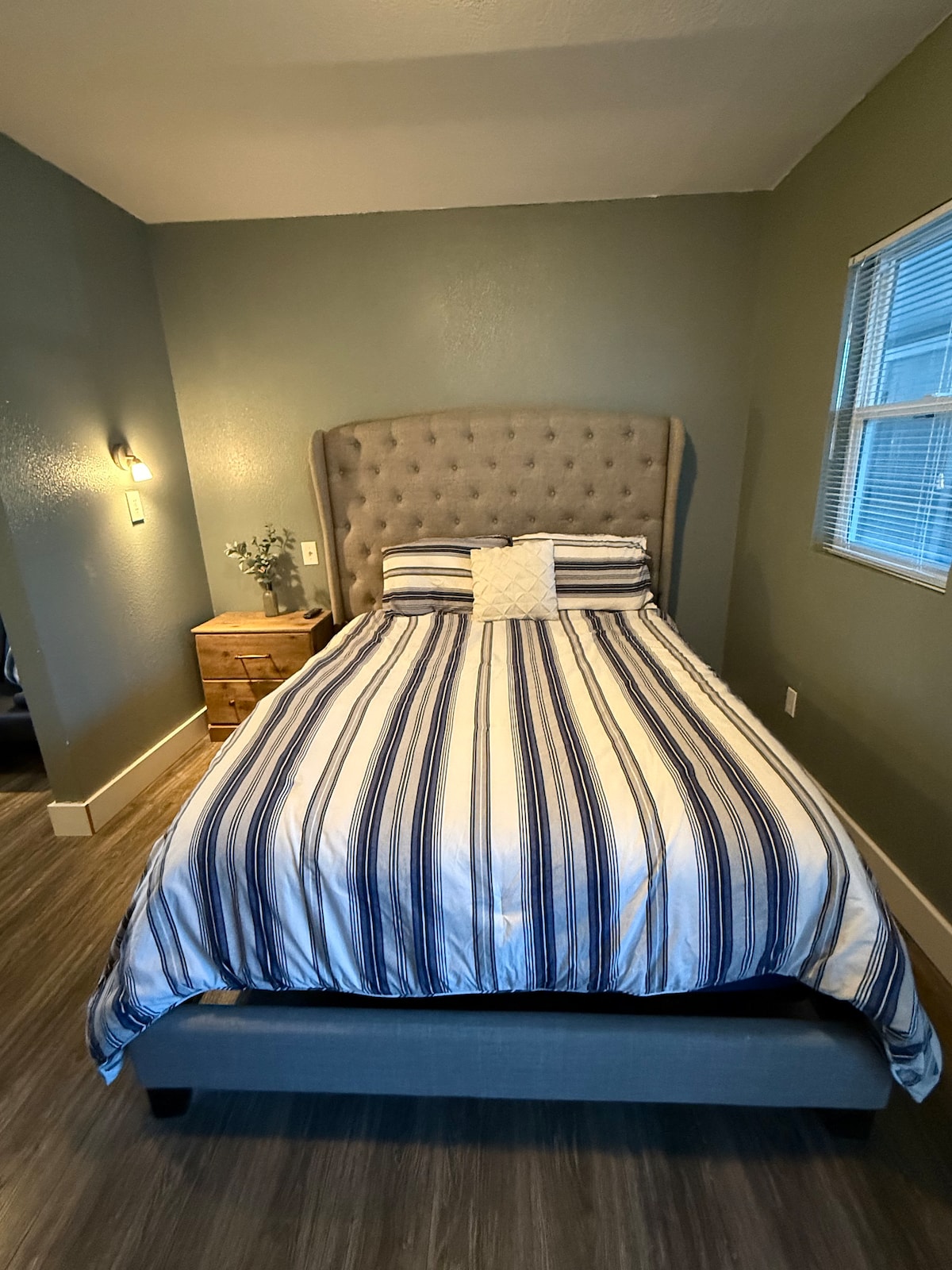 Our studio style hotel room is completed with new flooring and furniture. Includes a queen bed, side table, shared kitchen, dresser, free Wi-Fi, cable tv, and a side chair. Free parking with room for trailers, and a backyard space. We do require photo ID to be sent via Airbnb messages to verify your identification before you’re able to access the property.