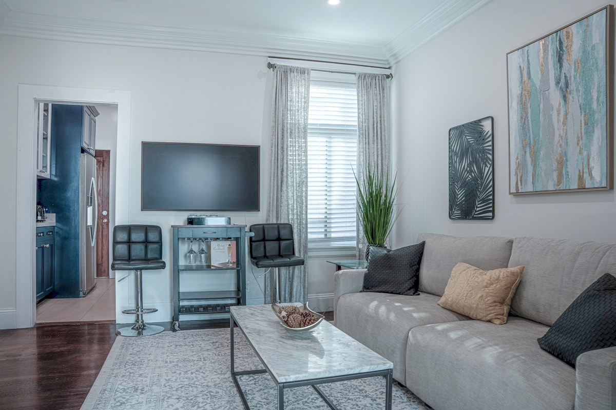 Diese große 3-Zimmer-Suite ist Teil meines Hauses, aber privat, separat und vom Rest der Residenz abgeschlossen. Es gibt einen privaten Eingang zu deiner Suite von der Lobby des Gebäudes. Die Suite verfügt über einen Ess-/Sitzbereich mit Esstisch/Arbeitstisch, ein Sofa (öffnet sich zum Queensize-Bett), einen Fernseher und eine kleine Terrasse. Französische Türen trennen dieses Zimmer vom riesigen, lichtdurchfluteten Hauptschlafzimmer (mit Kingsize-Bett). Gepolsterter Erkerfenstersitz. Großes Spa-Badezimmer, „Kochnische“-Nische, begehbarer Kleiderschrank. 560 Quadratfuß plus Bad, Schrank und Terrasse.