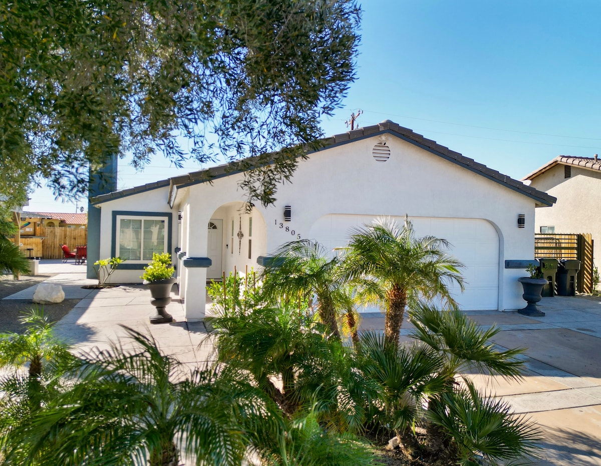 Surfe in der The Desert Beach Hut, einer atemberaubenden modernen 3-Schlafzimmer-Oase mit 5 Betten, einem Salzwasserpool, einem Spa, einem Grill und einer Feuerstelle. Genieße Spiele im Freien und drinnen, einen Kiesstrand und einen atemberaubenden Bergblick. Erlebe die perfekte Verschmelzung von Entspannung und Aufregung mit bequemem Zugang zu den Musikfestivals Coachella und Stagecoach, der Innenstadt von Palm Springs, der Aerial Tramway und dem Joshua-Tree-Nationalpark. Lass die fesselnde Einrichtung mit Strandthema deine Urlaubsstimmung steigern. Buche jetzt und reite die Welle!