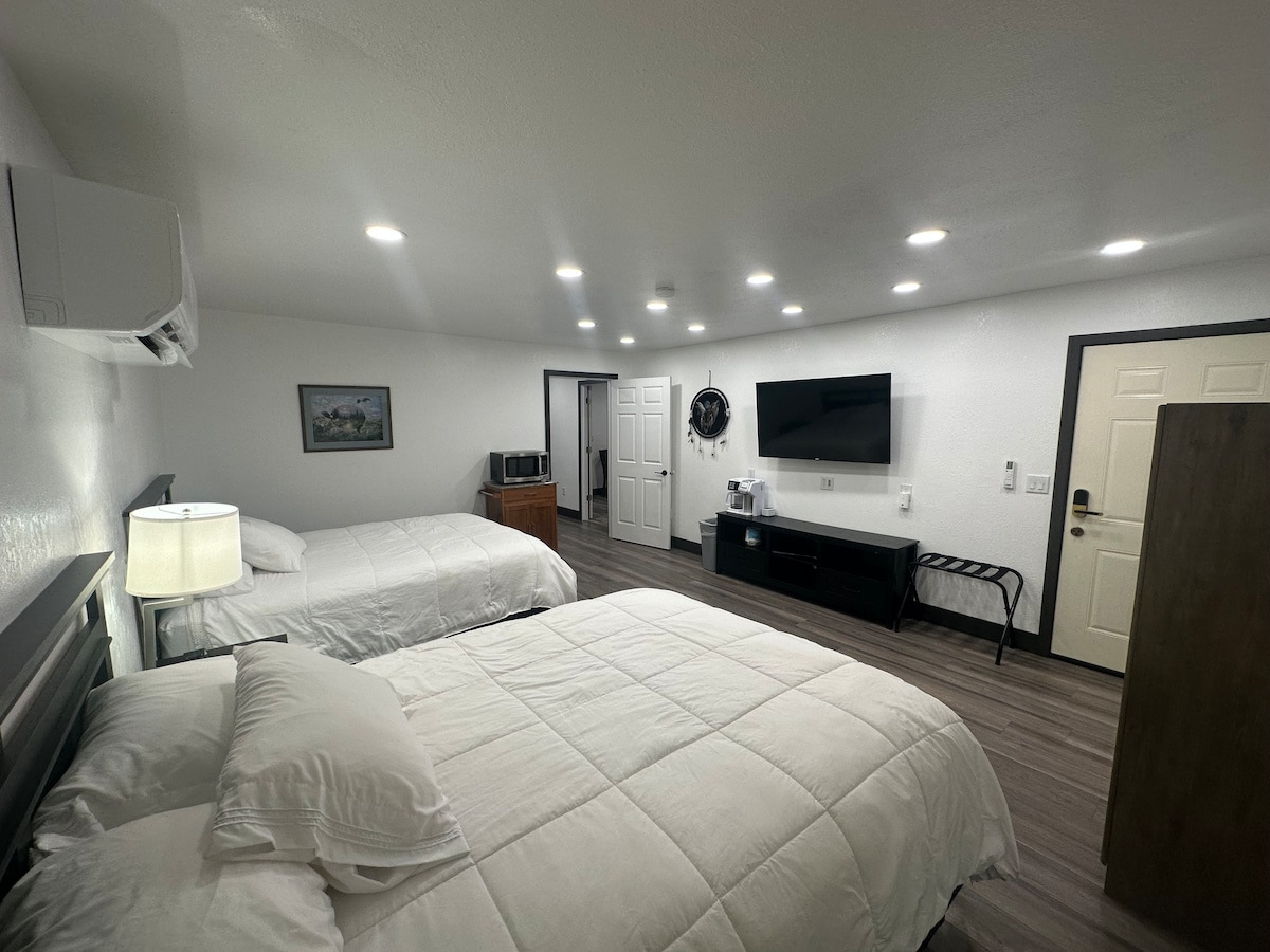 Dies ist eine 400 Quadratfuß große Suite mit 1 Schlafzimmer. Sie ist mit zwei Queensize-Betten, Klimaanlage und 55" Smart-TV ausgestattet. Die Küche ist komplett mit Utensilien, Geschirr und Geräten ausgestattet. Das Badezimmer verfügt über eine Glastürdusche und endloses heißes Wasser aus einem tanklosen Warmwasserbereiter.