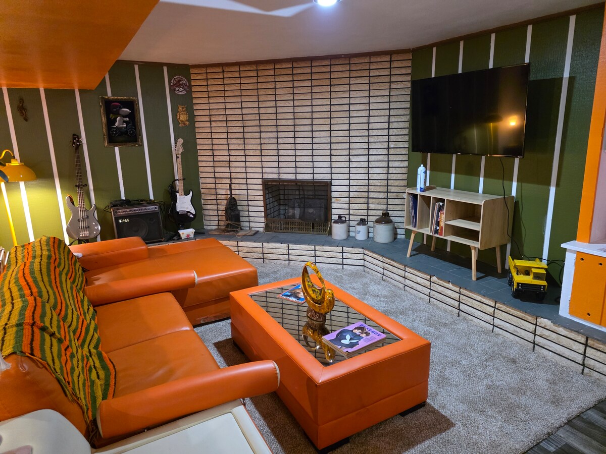 Genießen Sie diese große Studio-Wohnung im Untergeschoss, die Sie in die Vergangenheit zurückversetzt. Nostalgie pur: Dieses Studio verfügt über eine E-Gitarre und Bassgitarre sowie viele Artefakte aus den 70er-Jahren. Dieser Raum befindet sich in unserem Keller und verfügt über einen privaten Eingang in unseren vollständig eingezäunten Hinterhof mit einer überdachten Veranda. Gut erzogene Hunde willkommen Die Küchenzeile verfügt über einen Kühlschrank, einen Toaster, eine Heißluftfritteuse, eine Mikrowelle und eine Kaffeemaschine. Perfekt für einen schnellen Kurzurlaub zu zweit oder für Alleinreisende.