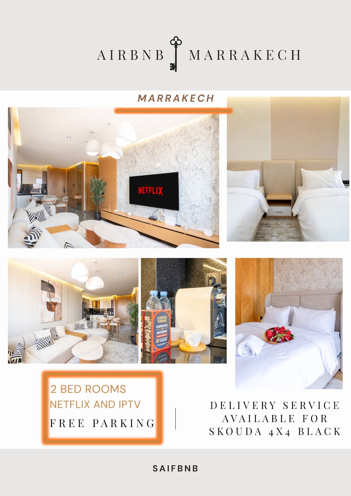 Discover a peaceful haven in Marrakech with this 128m² duplex apartment, featuring a private 60m² terrace, at the prestigious Le Vizir Resort. Accommodates up to 5 adults or 4 adults and 2 children. at the entrance of Marrakech, near the stadium. Calm and secure, with fiber optic WiFi, it's perfect for families and business travelers. Enjoy access to Le Vizir Park with 3 pools, including a women-only pool, kids' play areas, and a restaurant Ps: Marriage certificate required for couples