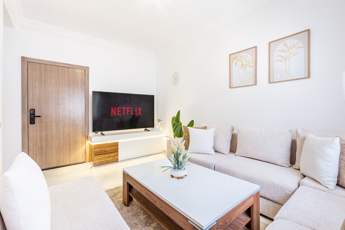 Entfliehen Sie in einer eleganten und entspannenden Umgebung in Marrakesch! Moderne und gemütliche Wohnung, perfekt für einen unvergesslichen Aufenthalt. Tauchen Sie ein in den Pool im Hotelkomplex und genießen Sie auch den Zugang zum Wasserpark mit 2 Pools, von denen einer ausschließlich für Frauen und viele andere Aktivitäten für Ihre Kinder geeignet ist Dieses liebevoll eingerichtete Apartment verfügt über . Ein umwandelbares Ecksofa. Eine komplett ausgestattete Küche Eine Suite mit einem Queensize-Bett Eigenständiger Zugang