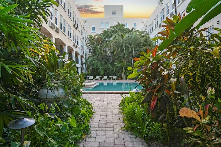 Serene, sun‑drenched studio overlooking heated pool and lush tropical courtyard at a 1926 historic landmark hotel residence on Palm Beach Island. This thoughtfully appointed room has private max-speed wifi, new AC, 100% cotton linens/towels, full blackout drapes, luggage storage, and 24/7 front desk. Parking spot *included* for this unit but no car needed at this unbeatable location! Gated beach, shops, cafés, museums, historic landmarks, and nature trails all within three blocks.