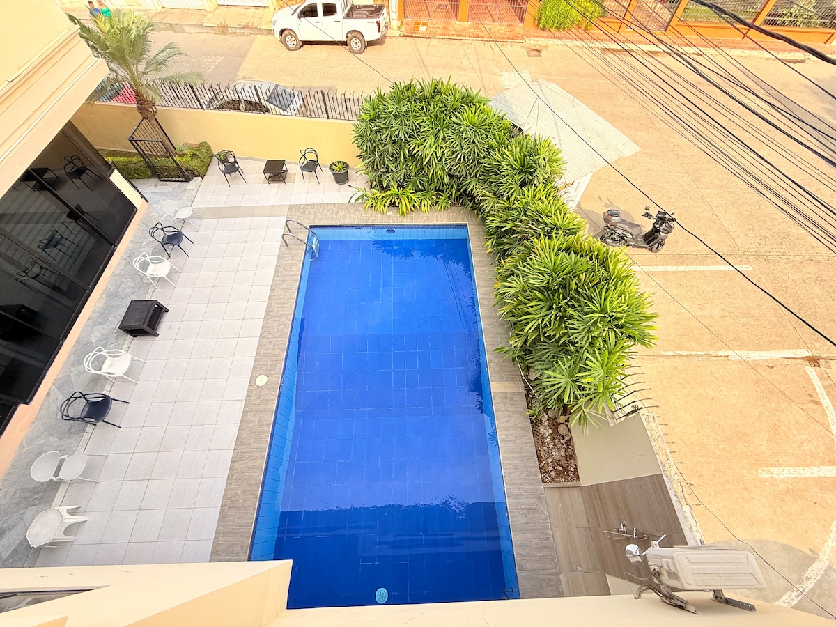 Gemütliche und gut ausgestattete Suite in einer exklusiven und sicheren Gegend. Genieße einen komfortablen Raum mit TV, Klimaanlage, ausgestatteter Küche und eigenem Bad mit heißem Wasser. Das Zimmer verfügt über ein quadratisches und ein halbes Bett und eine ideale Atmosphäre für Ihre Erholung. Darüber hinaus hast du Zugang zur Waschmaschine, zum Trockner und zu einem schönen Pool, um dich während deines Aufenthalts zu entspannen.