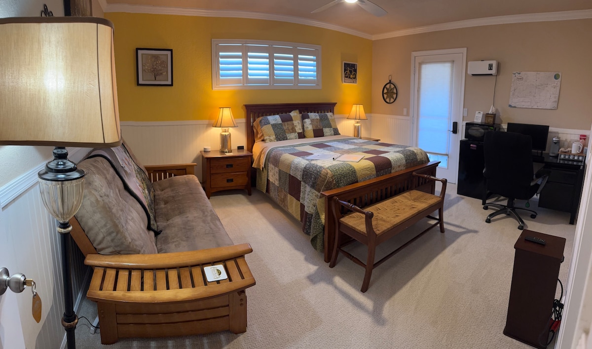 Wir bieten ein Gästehaus mit Rundum-Service und einem privaten Eingang. Mit Liebe zum Detail und mit einem lustigen modernen Flair aus der Mitte des Jahrhunderts eingerichtet! Es verfügt über ein Schlafzimmer, ein Bad, eine Küche mit allen Annehmlichkeiten (einschließlich einer gut sortierten Kaffeestation) und ein Wohnzimmer mit einem Smart-TV und Satellitenfernsehen. Wir bieten auch WLAN an. Solltest du Wäsche waschen müssen, haben wir eine brandneue Waschmaschine und einen Trockner für dich. Das Gästehaus verfügt über eine private Terrasse, auf der du einen lokalen Wein trinken und den schönen Sonnenuntergang genießen kannst! Wir bieten auch einen Tisch im Freien mit Stühlen neben der Terrasse für deinen Genuss! Von der Buchung bis zum Check-out stehen wir dir zur Verfügung, falls du Fragen hast oder etwas benötigst. Unser Ziel ist es, deinen Aufenthalt so angenehm wie möglich zu machen. Wir hoffen, die Möglichkeit zu haben, jeden unserer Gäste zu treffen/begrüßen zu können, während sie im Gästehaus übernachten. Sollte das jedoch nicht möglich sein, werden wir alle Unterkünfte bereithalten! Wir versuchen auch so flexibel wie möglich zu sein. Bitte zögere nicht, uns nach einem frühen Check-in oder späten Check-out zu fragen, falls erforderlich. Wir stellen einen Hausordner zur Verfügung, der relevante Informationen und unsere „Favoritenliste“ für die Central Coast Area enthält. Shannon und ihr Mann Reggie wohnen im Haupthaus auf dem Grundstück. Das Gästehaus liegt inmitten vieler schöner, alter Eichen in einer malerischen und ruhigen Nachbarschaft. Es liegt zentral in der Nähe der Innenstadt von Atascadero, mit einfachem Zugang zum Highway 101 North/South und zum Highway 41 nach Morro Bay. Uber Pool vor Ort, für Hausbesitzer, (frage uns jedoch im Voraus nach unseren Richtlinien und der Möglichkeit, den Pool und/oder Whirlpool zu nutzen)