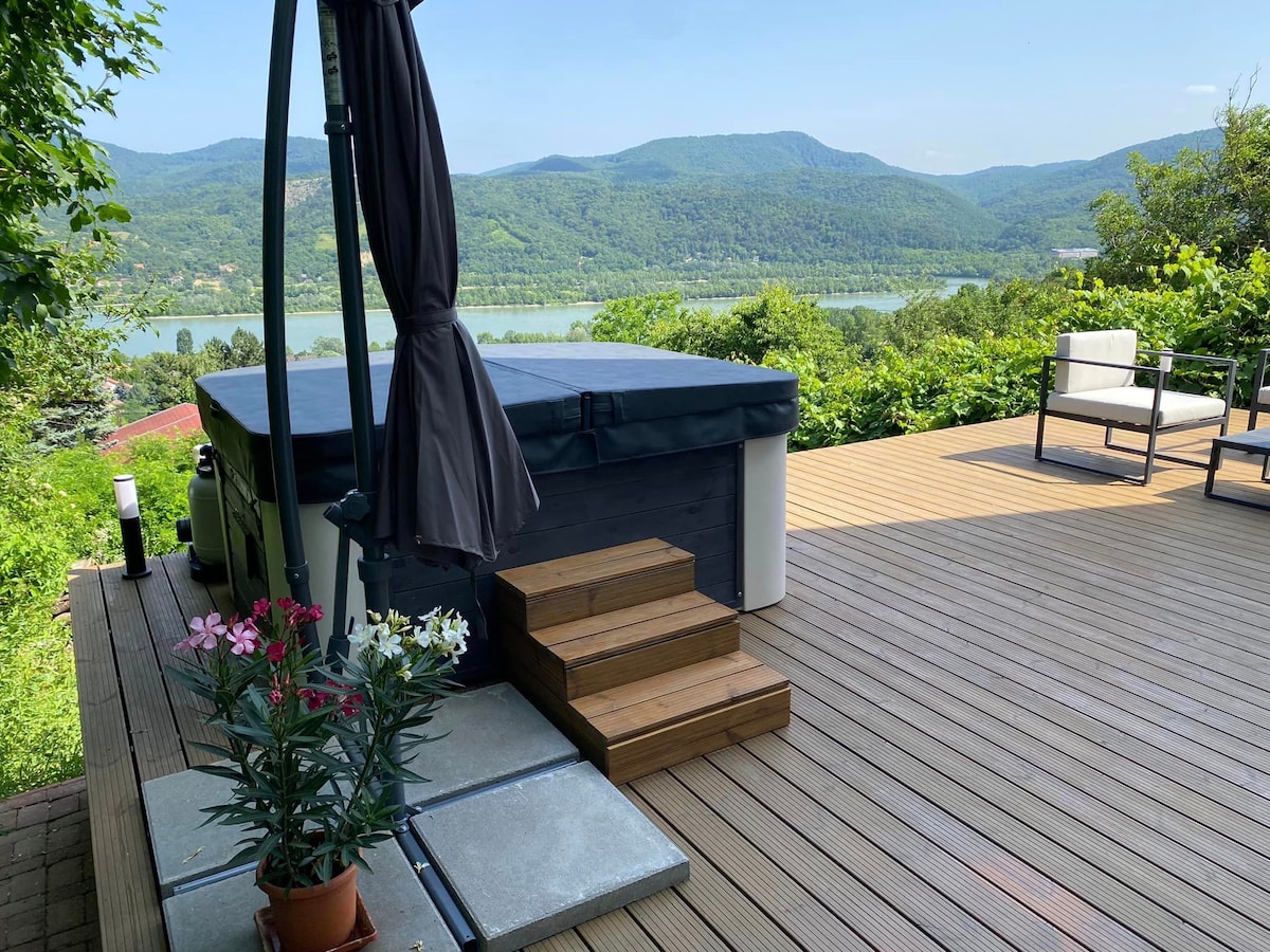 Schöner Panoramablick, frische Luft und Ruhe. In dieser Umgebung wurde das Haus gebaut, dessen obere Ebene die braune Wohnung ist. Es verfügt über eine 30 m ² große private Terrasse, auf der du die Donau und das Schloss Visegrad genießen kannst. Du wirst es lieben, am Abend ein Glas Wein mit einem Glas Wein in den Händen für Boote und die Lichter von Visegrad zu trinken. Das Apartment hat zwei Etagen, unten befindet sich die riesige Terrasse, das Wohnzimmer, die Küche und das Badezimmer, es gibt zwei Schlafzimmer im Obergeschoss.