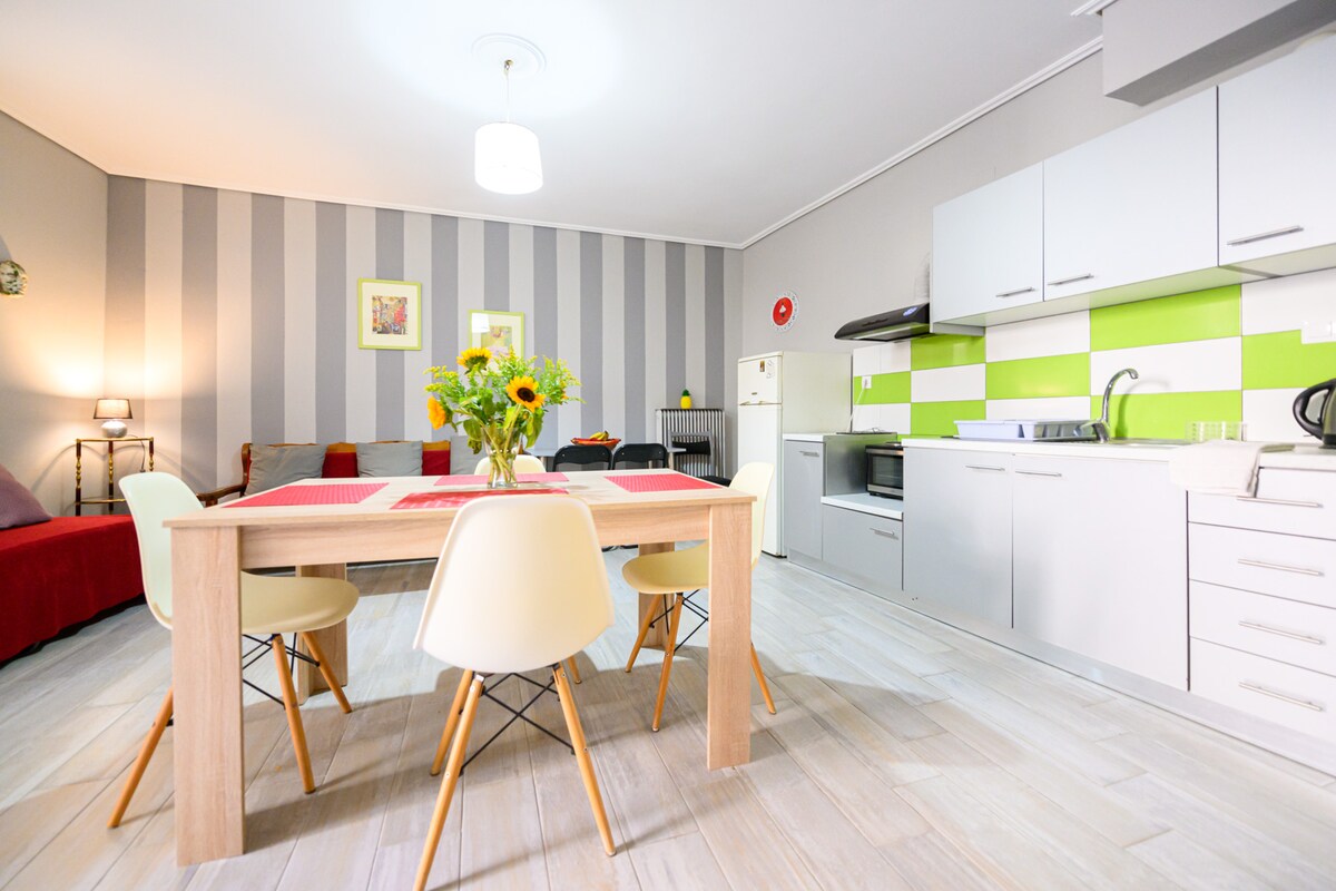 Neu fertiggestellt, ein helles, stilvolles und voll ausgestattetes, elegantes, 70 m² großes, voll klimatisiertes Loft, das problemlos die Bedürfnisse von 1–5 Reisenden erfüllen kann. Es ist in Kalamata in einer nicht überfüllten Gegend auf einer ruhigen Straße mit einfachem Parken gebaut. Gäste haben vollen Zugang zu allen Haushaltsgeräten, Ausstattungen, Annehmlichkeiten sowie WLAN-Verbindung. Sowohl der örtliche Strand (1 km) als auch das Stadtzentrum (2 km) sind ein einfaches Ziel. Lebensmittelgeschäfte, Imbisse und kleine Bäckereien sind alle bequem zu Fuß erreichbar.