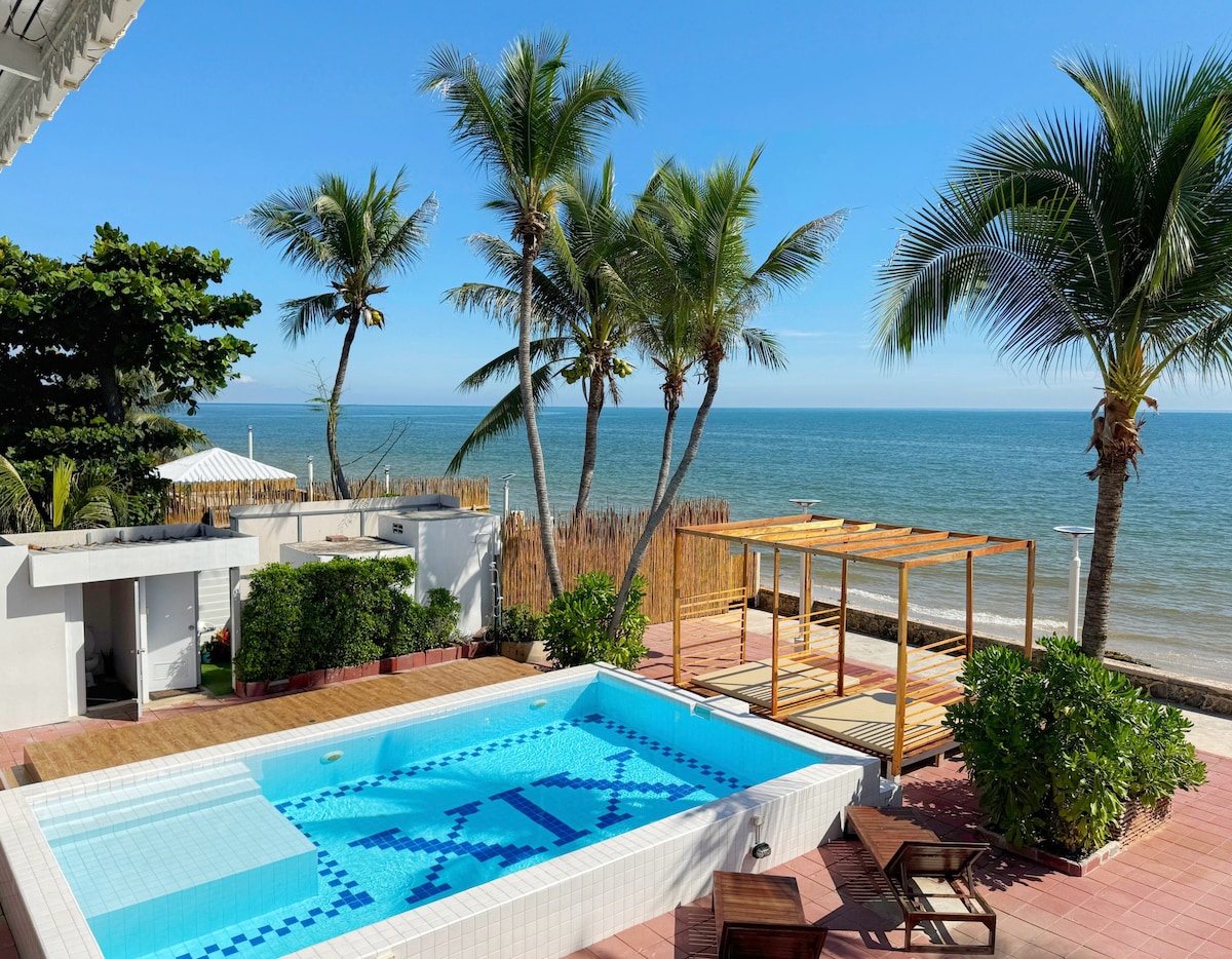150m² / 1,615ft² , Spacious w/ Multiple Beds 🌊 Beachfront unit spanning both floors of the mansion, ideal for Big groups. ✔️ 1 King, 1 Queen, 4 Singles, 2 Queen , Sofabeds ✔️ 2 Pools + Beach cabana & Sunbeds ✔️ Indoor & Outdoor Kitchens with BBQ Grill essentials ✔️ Two Dining areas : Inside & on balcony beside the pool 🎱 Pool table + Beach paddle & volleyball 🚗 Ample Parking for cars & vans.