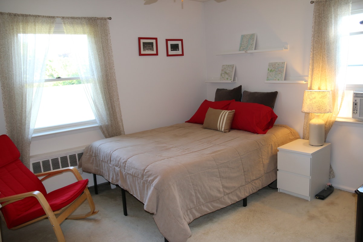 The apartment features a newly renovated bathroom and kitchen on the 2nd floor of a private house with a separate entrance in a peaceful neighborhood. Our cozy modern space is perfect for a solo traveler or a couple seeking a quiet and comfortable stay with a home-like setting to work from with WiFi, unwind and watch TV, or spend time with loved ones. We accept both short-term and long-term stays.
