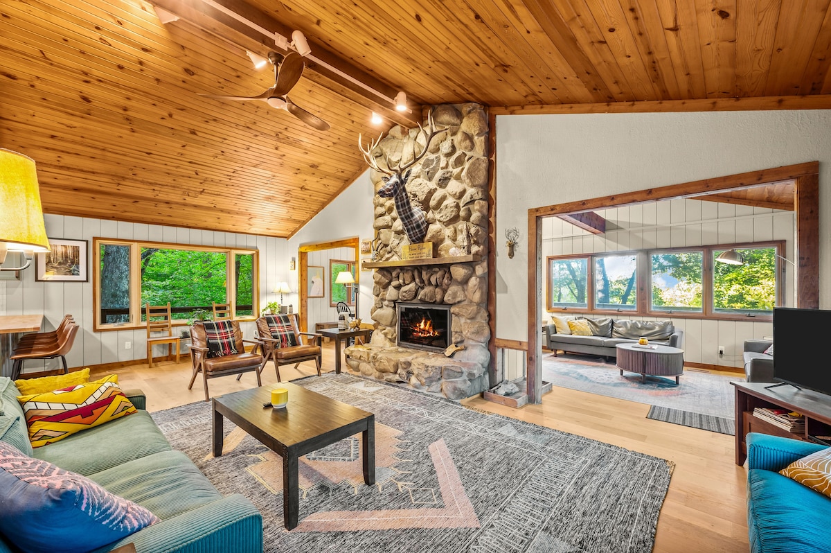 Luxus trifft Natur: Waldhütte am Strand, 1 Stunde von Chicago entfernt. Buche deinen Aufenthalt in unserem Designer-Blockhaus am Lake Michigan, nur wenige Schritte vom Strand entfernt und eingebettet in einen ruhigen Wald. Es ist der perfekte Rückzugsort. Unsere charmante Hütte wurde 1932 erbaut und bietet Platz für 8 Personen in 4 Schlafzimmern. Genießen Sie 2 Wohnbereiche, einen Steinkamin, eine Feuerstelle, Spiele, Rätsel und Bücher. Es wurde in Country Living und der NYT vorgestellt und ist perfekt für Familien, Freunde oder Retreats. Buchen Sie jetzt und schaffen Sie bleibende Erinnerungen in Michiana.