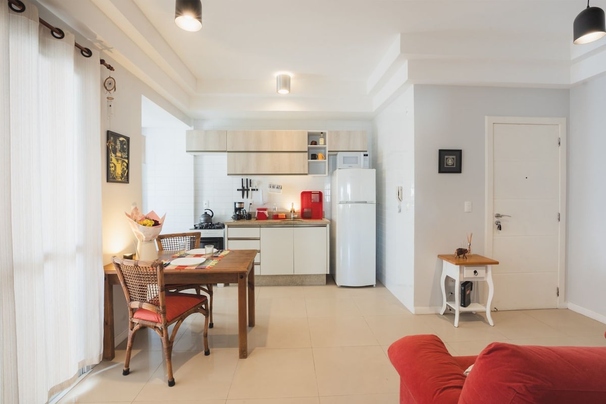 Auf der Suche nach einem gemütlichen Ausgangspunkt im Herzen der Stadt? In diesem gut geplanten Loft wirst du dich wie zuhause fühlen. Das Hotel liegt in der Innenstadt von Florianopolis und ist perfekt für jemanden, der die Insel erkunden oder an einer Veranstaltung in der Nähe teilnehmen möchte. Beinhaltet: - Queensize-Doppelbett - komplette Gourmet-Küche - Waschmaschine und Trockner - Großer Tisch für Mahlzeiten und Homeoffice - 360-Grad-Drehfernseher, damit du von jedem Ort im Loft aus zuschauen kannst - Sauberes und modernes Badezimmer - WLAN - Komplette Klimaanlage