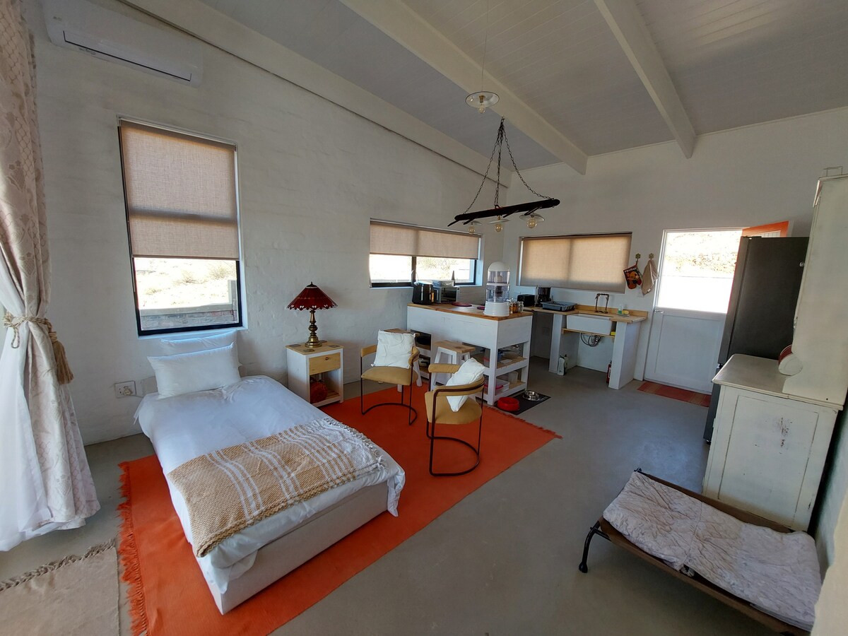 Escape to our stylish cottage in the heart of Prince Albert, Groot Karoo. This charming getaway boasts a spacious room with a king-sized bed and ensuite bathroom (and floor-bed for a small child and cot for a smaller child). Enjoy cooking in the fully equipped kitchen and unwind in your private garden oasis on a comfortable stoep. Located in a tranquil setting, it's perfect for solo travelers or couples seeking relaxation or couples with small kids. Larger groups? Consider booking both cottages!