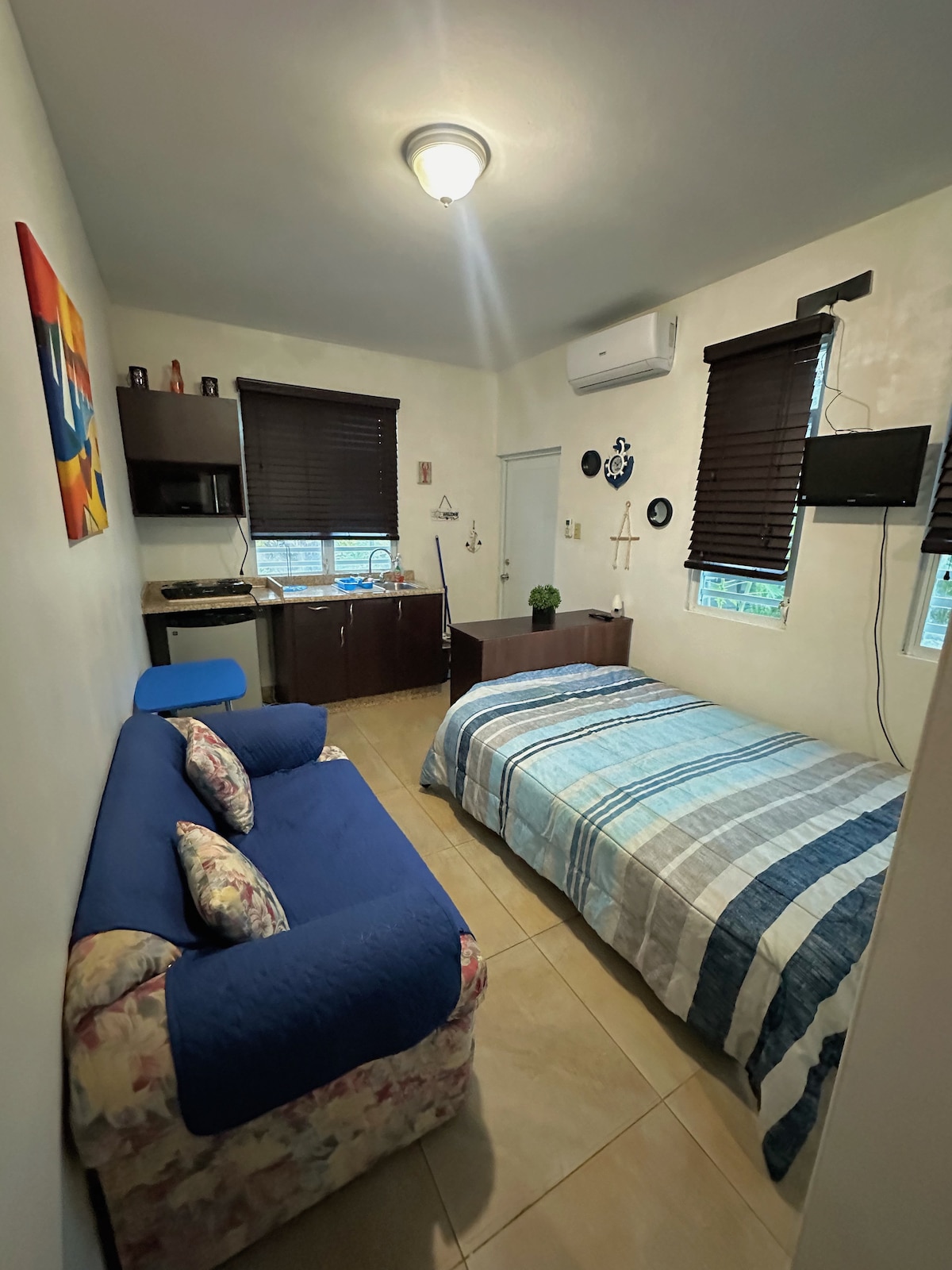 Wenn Sie in der Nähe des Strandes übernachten und sich ein paar Tage entspannen möchten, sind Sie hier genau richtig. Komfortables und praktisches Studio nur wenige Schritte vom Strand Mar Bella im Dorf Vega Baja, Puerto Rico, entfernt. Ruhiger Ort und in der Nähe von ausgezeichneten Restaurants und Supermärkten. Das Studio ist 10-15 Minuten von den schönsten Stränden des Nordens wie Mar Chiquita, Posa Las Mujeres, Playa la Esperanza, ganz in der Nähe des Ojo de Agua und des Manantial de Vega Baja entfernt. Es verfügt über eine Kaffeemaschine, einen Mini-Kühlschrank und ein eigenes Bad.