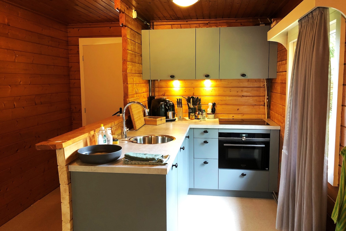 Holzhaus mit Pelletofen, Badewanne & Veranda