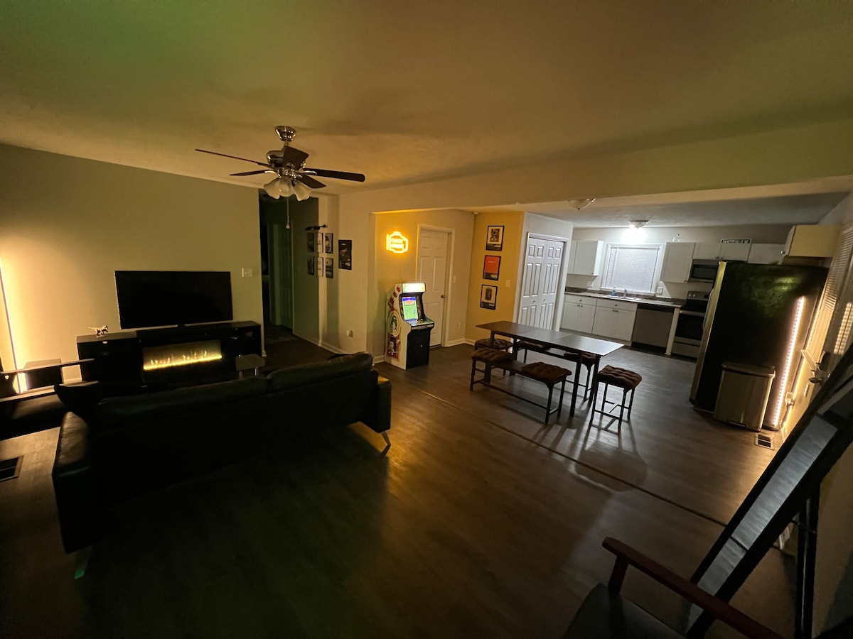 Diese private Fayetteville-Suite ist perfekt für Familienbesuche oder kleine Gruppen und bietet bequem Platz für bis zu drei Gäste. Genieße einen 65-Zoll-Fernseher im Wohnzimmer und einen 55-Zoll-Fernseher im Schlafzimmer, beide mit Netflix, Disney+, Premier und Jellyfin. Das Schlafzimmer verfügt über ein Kingsize-Bett für zwei Erwachsene und ein Kleinkind, während das Wohnzimmer über ein Queensize-Schlafsofa für einen Erwachsenen oder zwei Kinder verfügt. Mit einer voll ausgestatteten Küche, einem Arbeitsbereich, einem Badezimmer, einer Waschküche und einem geschlossenen Hof ist sie perfekt für jeden Aufenthalt.