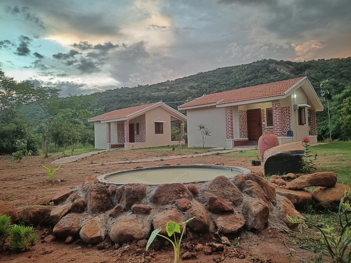 Entfliehe dem Alltag in unser CO₂-negatives Bauernhaus zwischen Bangalore und Hosur. Atme die frische Luft inmitten von Bio-Bauernhöfen und solarbetriebenen Annehmlichkeiten ein. Erkunde die Heilpflanzen des Gartens, pflücke frisches Gemüse und entspanne dich am Wasser. In nahegelegenen Städten findest du praktische Einkaufsmöglichkeiten. Perfekt für umweltbewusste Rückzugsorte, die Ruhe und Nachhaltigkeit suchen. Es ist auch mit einer privaten Wetterstation ausgestattet, deren Link dir bei der Buchung gesendet wird, um das Live-Wetter am Standort zu verfolgen.
