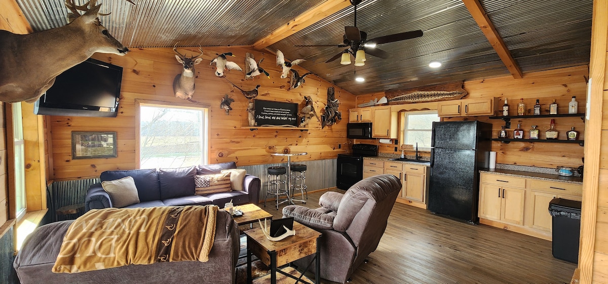 Das Driftwood ist eine abgeschiedene Hütte, die sich auf 3 Hektar entlang des 11 Point River befindet. Die Hütte verfügt über ein Schlafzimmer mit Kingsize-Bett und ein Etagenbett mit zwei Einzelbetten im Flur. Es gibt außerdem einen Wohnbereich, eine voll ausgestattete Küche und eine Waschmaschine/einen Trockner. Kostenloses WLAN mit Smart-TV. Der Whirlpool ist das ganze Jahr geöffnet. Es gibt einen Outdoor-Feuergrubebereich mit einigen Sitzgelegenheiten im Freien. **BRENNHOLZ verfügbar **1 Paket 10 $ ** **Haustiere sind willkommen zu einer Gebühr von 50 $ * **AUSSTATTER in der Nähe verfügbar **