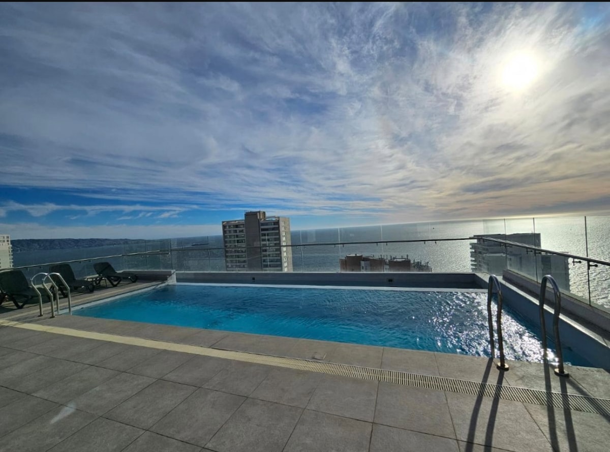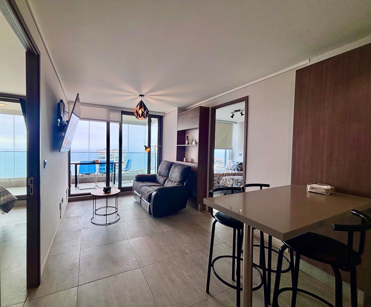 Moderne Wohnung in einem Wohnhaus, komplett ausgestattet, um sich am Meer mit Blick auf die Bucht von Valparaíso zu entspannen. In der Nähe von Supermärkten, Restaurants und Einkaufszentren. Mit Zentralheizung und Glasfaser-Internet zum Arbeiten oder Entspannen.