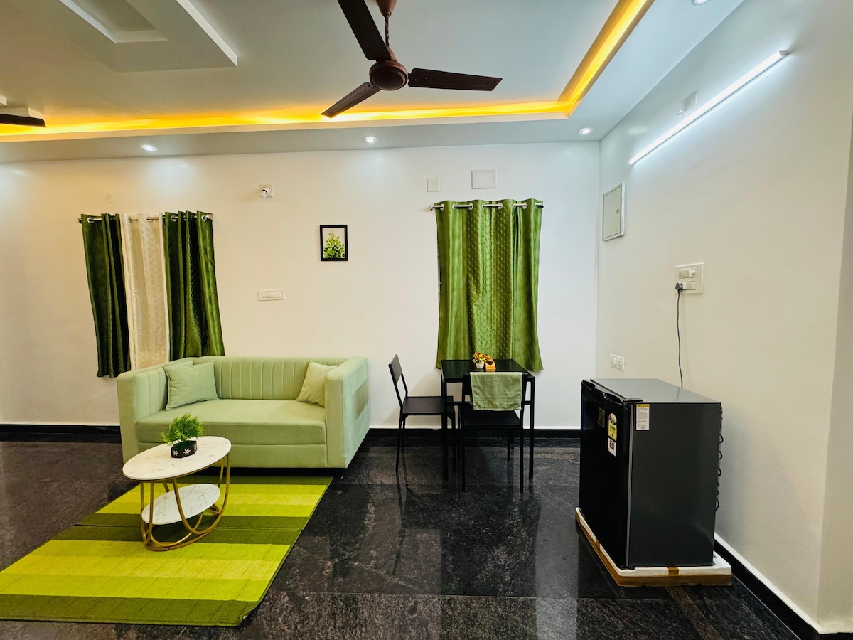 Dies ist ein 2-Bett-2-Bad-Apartment mit einer voll ausgestatteten Küche. Die Gäste haben Zugang zur kompletten Wohnung. Jede Etage verfügt nur über eine Wohnung, sodass du eine Fülle von Privatsphäre hast. Voll funktionsfähige Küche , High-Speed-WLAN, zwei Klimaanlagen-Schlafzimmer, zwei Badezimmer mit Hochleistungsgeyseren,Wasserfilter , Kühlschrank, Waschmaschine und TV . Power-Backup und Lift sind verfügbar. Die Lage ist in der Nähe von Zoo, TCS iON Digital Zone, Cherlopalli Kreis, Srinivasa Mangapuram, 8 km von Alipiri.