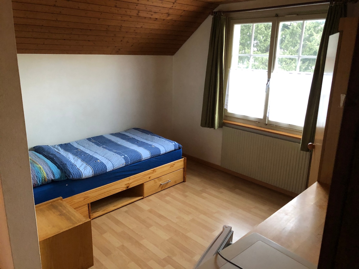 Gemütliches Zimmer mit Blick ins Grüne Unser Gästezimmer auf einem privaten Stockwerk bietet viel Privatsphäre und Ruhe. Es verfügt über ein 140cm Bett und einen schönen Sitzplatz mit Blick ins Grüne. Der private Eingang und ein kostenloser Parkplatz sorgen für zusätzlichen Komfort. Das private WC mit Dusche ist etwas älter, aber sauber und funktional. Gäste können den Grill im Garten mitbenutzen. Perfekt für entspannte Tage in der Natur. Wir freuen uns, Sie bei uns willkommen zu heissen!