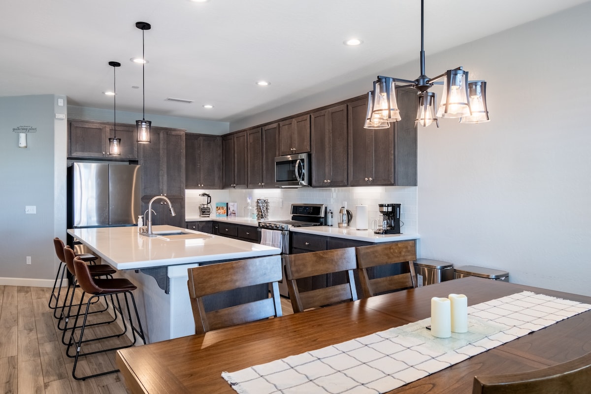 Willkommen in einem brandneuen Haus, Baujahr 2022, eingebettet am Ende einer ruhigen Sackgasse. Diese geräumige Residenz mit vier Schlafzimmern bietet insgesamt 10 Betten und bietet deiner Gruppe bequem Platz. Ein offenes Design verbindet die Küche, den Essbereich und das Wohnzimmer und verstärkt das Raumgefühl. Die gut ausgestattete Küche verfügt über alle wichtigen Dinge, die du benötigst. Das Wohnzimmer ist mit einem 65-Zoll-Roku-TV ausgestattet, der durch einen elektrischen Kamin im TV-Ständer ergänzt wird.