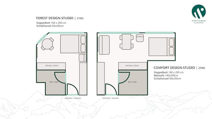 Willkommen in unseren zwei komplett renovierten Studios im Zentrum von Arosa – unserem Forest Design-Studio und unserem Comfort Design-Studio.