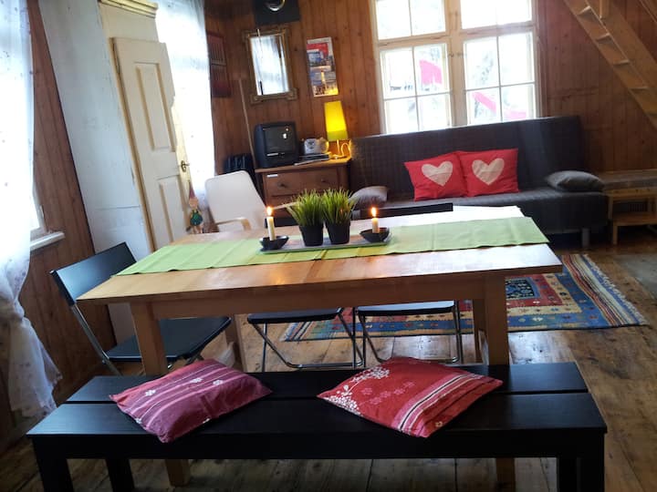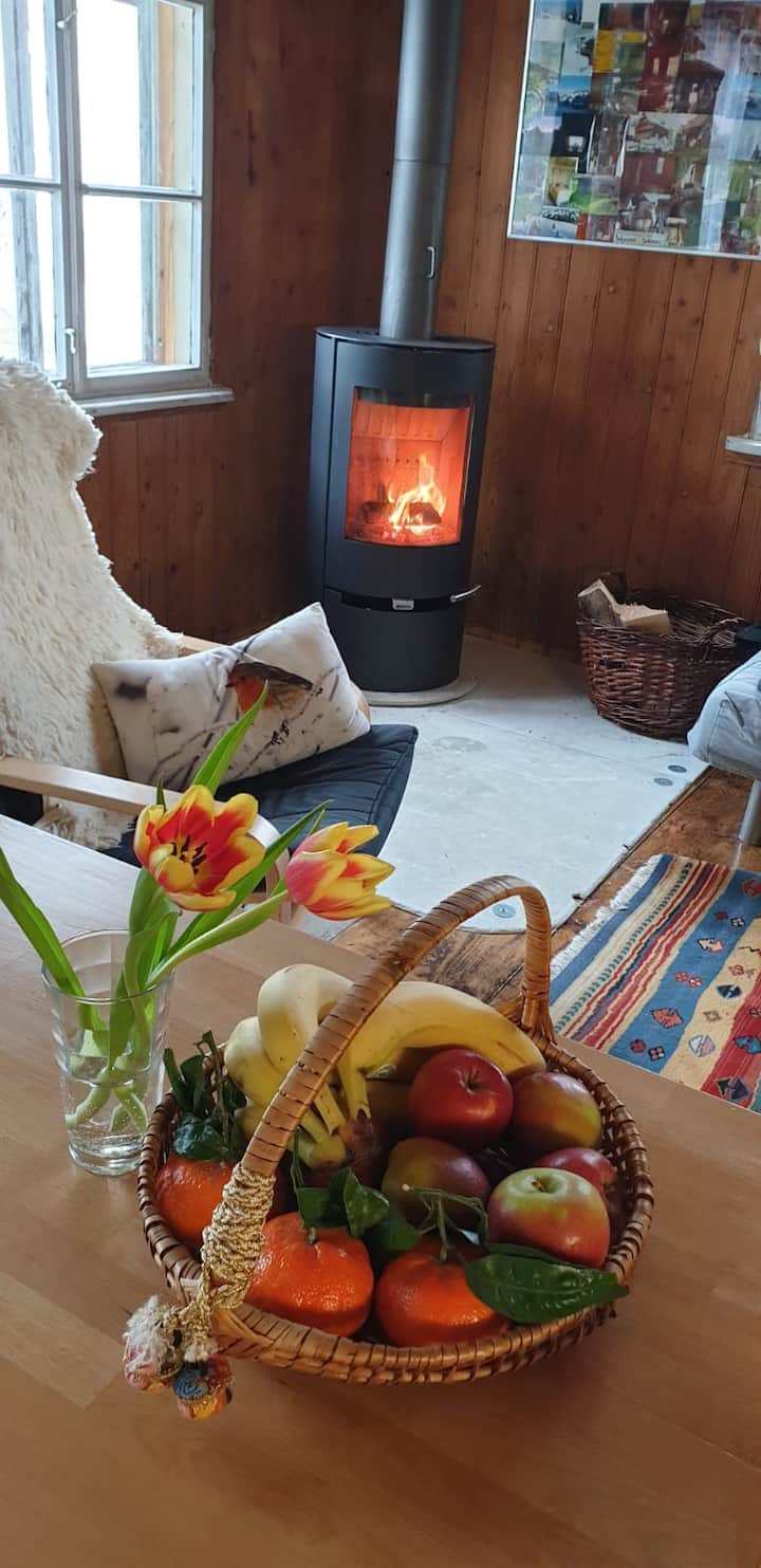 Zurück zum Leben mit Mensch und Tier. Auf kalten Tagen werden die Wohnräume mit einem traditionellen Holzofen und einem Badezimmer mit einer Infrarotheizung beheizt.