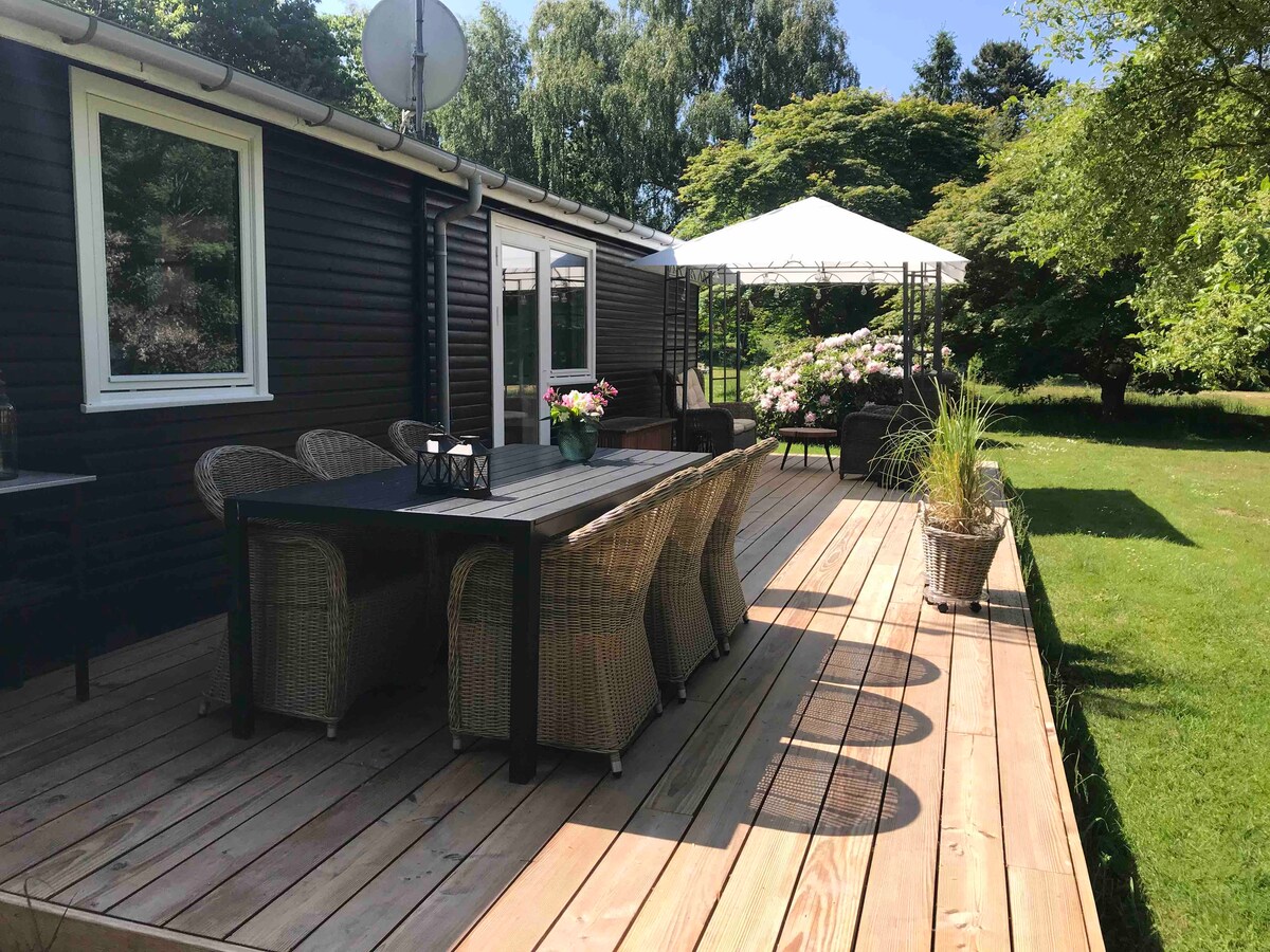 Kleines Holzhaus in einem großen parkähnlichen und üppigen Garten, privat und getrennt vom Haupthaus, nur ein paar Minuten von einem großen Wald, schönen Stränden und einer charmanten Stadt mit Geschäften, Cafés und Restaurants entfernt und in der Nähe des Zuges. Es verfügt über ein Hauptraum mit zwei zusammengefügten Betten, eine separate Küche für einfaches Kochen und ein Badezimmer. Die Terrasse hat ein Dach und ist von Blumen, Bäumen und Büschen umgeben. Geeignet für einen romantischen Kurzurlaub.