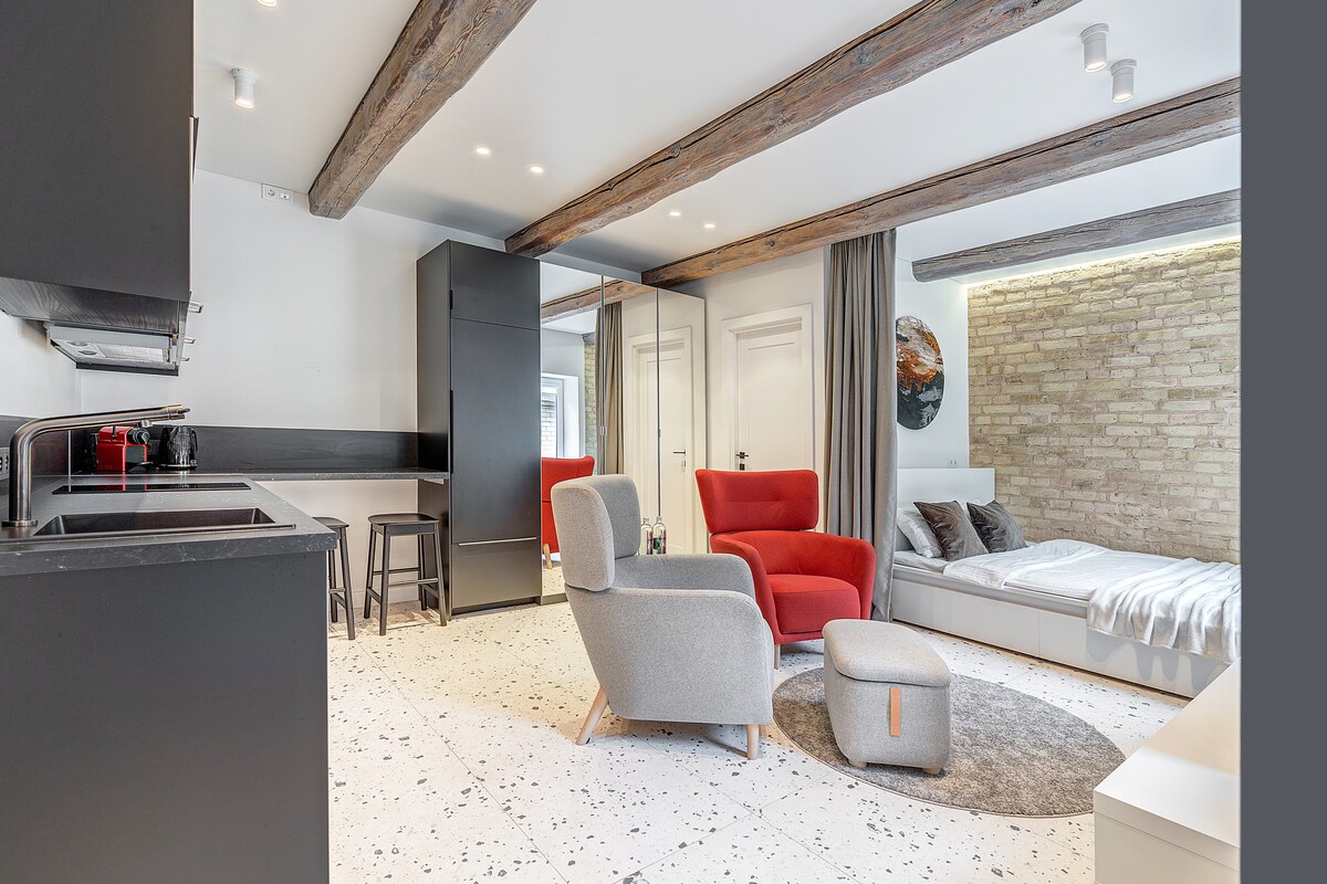 In den einzigartigen 48 qm großen Apartments finden Sie zwei Kingsize-Betten, Internet, Klimaanlage, eine tolle Dusche, eine voll ausgestattete Küche und 4 Arbeitsplätze (2 Tische + 2 Fensterbänke). Im Herzen der Altstadt von Vilnius haben Sie die Möglichkeit, den historischen Hauch der Vergangenheit zu spüren, indem Sie die 500 Jahre alten Holzbalken, gotischen Mauerziegel, Gips und Artefakte berühren. In einem Umkreis von 300 m finden Sie 33 Restaurants, 2 Supermärkte, 5 Museen und 12 Kirchen! Sie werden es nicht bereuen - es ist ein wirklich magischer Ort!