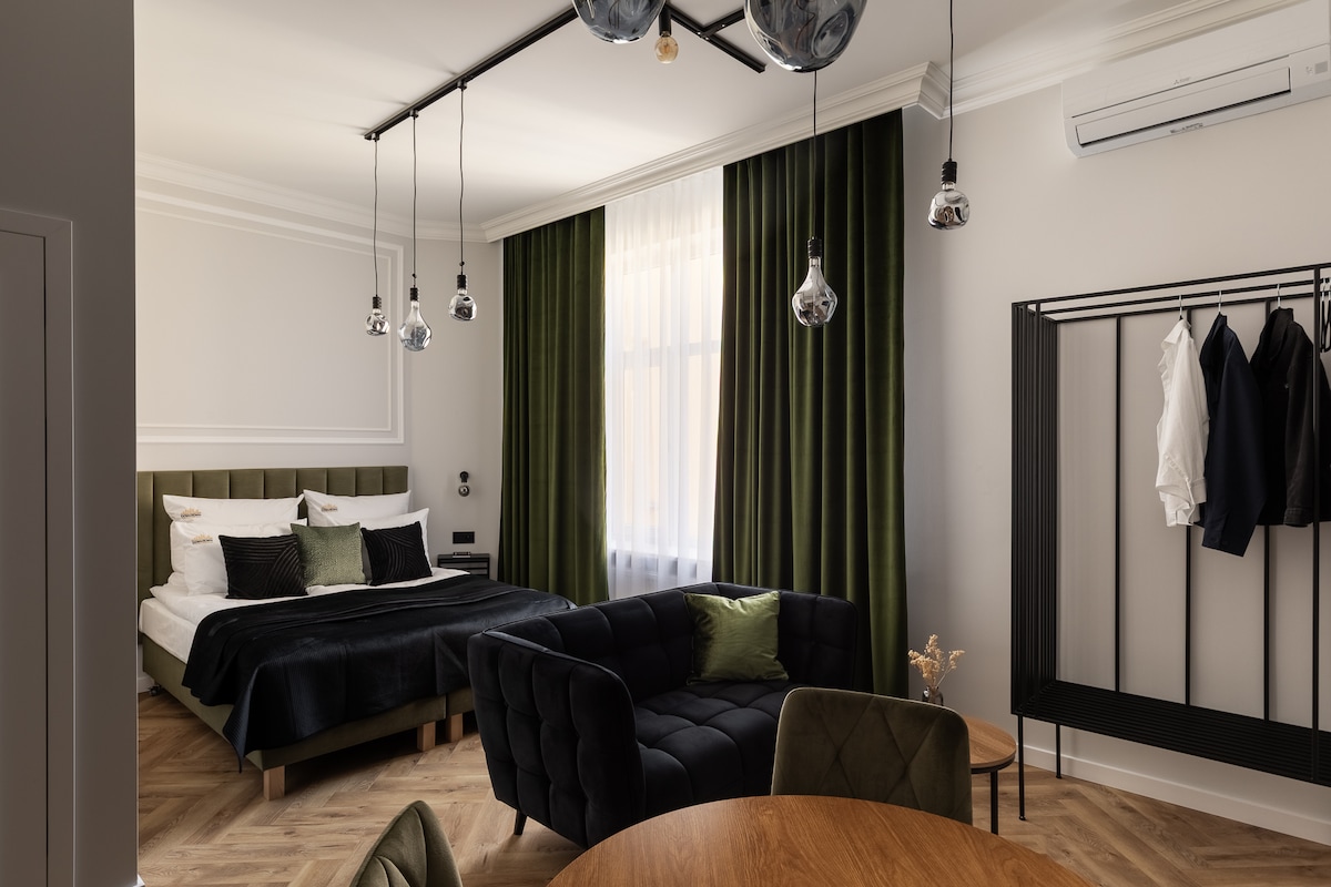 View lovely historic Old Town buildings from this 40sqm contemporary apartment located on Wielopole 17 street, perfectly between the Main Square and Jewish Quarter. Revive in air-conditioned interior with modern furnishings, and natural wood flooring. Entertain with the Smart TV. The apartment consists of: — living room with a sofa bed and dining area, — separate bedroom with queen size bed, — fully equipped kitchen, — central AC, — bathroom with a large shower, — fast WiFi.