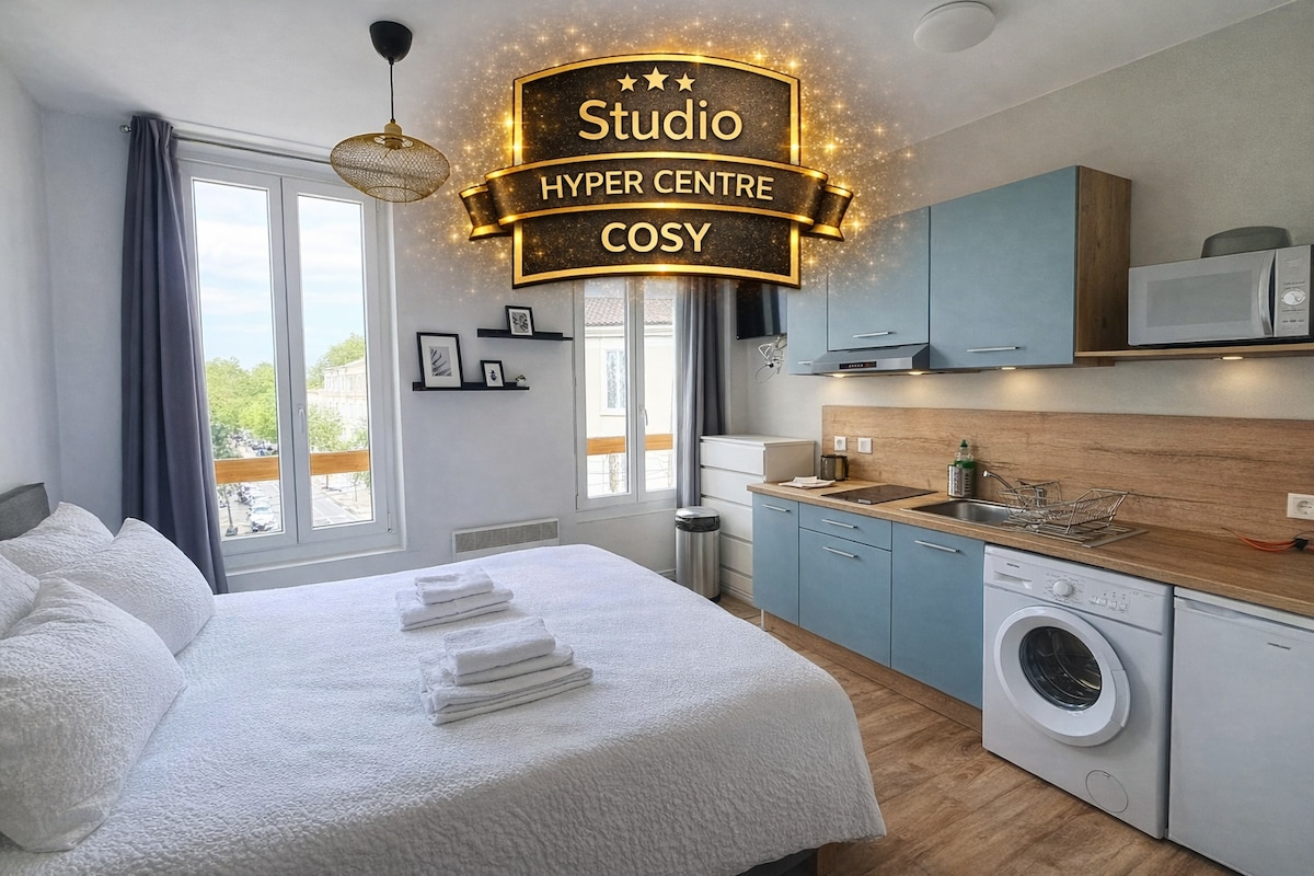 LOC-AGEN·fr vous présente ce grand studio climatisé de 30m2. A 3 min à pied de la gare, il est au RDC et donne sur une petite rue à sens unique très calme (volets roulants). Prestations hôtelières : ✩ Lit fait à l'arrivée ✩ Serviettes de toilette fournies ✩ Ménage de fin de séjour inclus ✩ WiFi ✩ Capsules de café de bienvenue ✩ Toutes les commodités sont accessibles à pied : Carrefour City, McDo, cinéma, boulangerie, pharmacie. ✩ Gare et centre ville à 5 min, Fac à 10 min à pied.