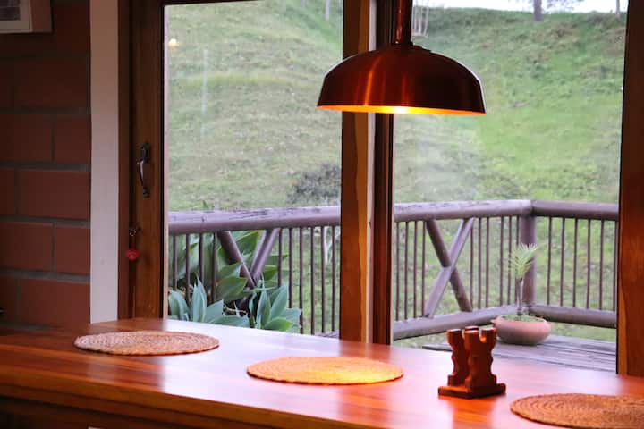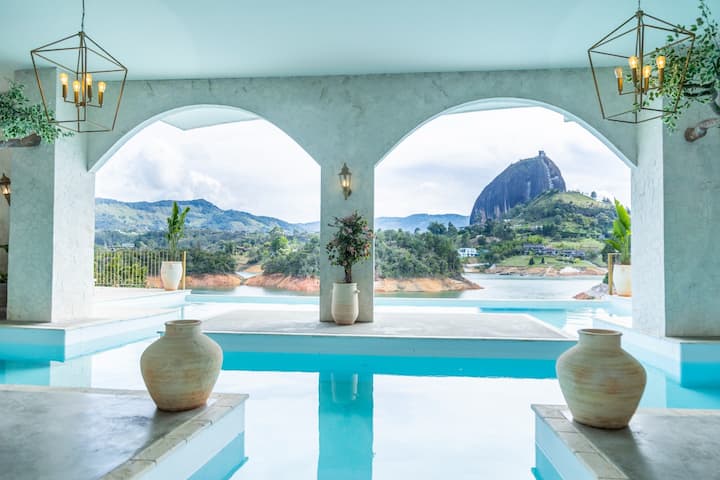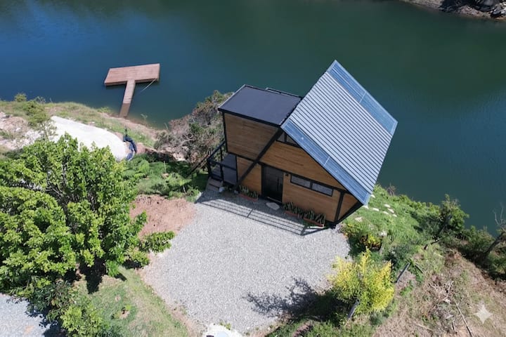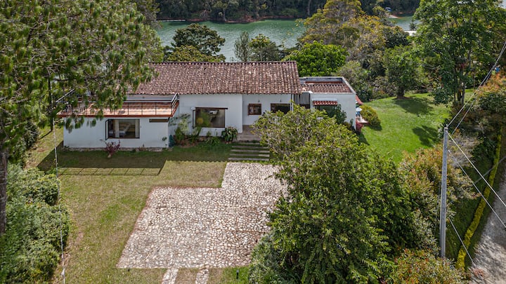 Häuschen mit Ausgang zum See und Blick auf den Stein, Guatape