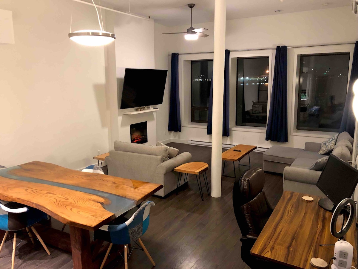 Ein Aufzug bringt dich in die oberste Etage dieses denkmalgeschützten Gebäudes, das sich an einer von Bäumen gesäumten Denkmalstraße in der ältesten Stadt des Landes befindet. Hier findest du eine super einzigartige Einheit mit brandneuem allem vor – King- und Queen-Size-Endy-Betten, Zweiersofa und ausziehbare Couch, voll ausgestattete Küche und einen speziellen Arbeitsplatz. Im Zentrum von allem, was Saint John zu bieten hat, bist du nur wenige Schritte vom City Market, der TD-Station, dem Area 506 und vielen tollen Cafés, Restaurants und Bars entfernt.