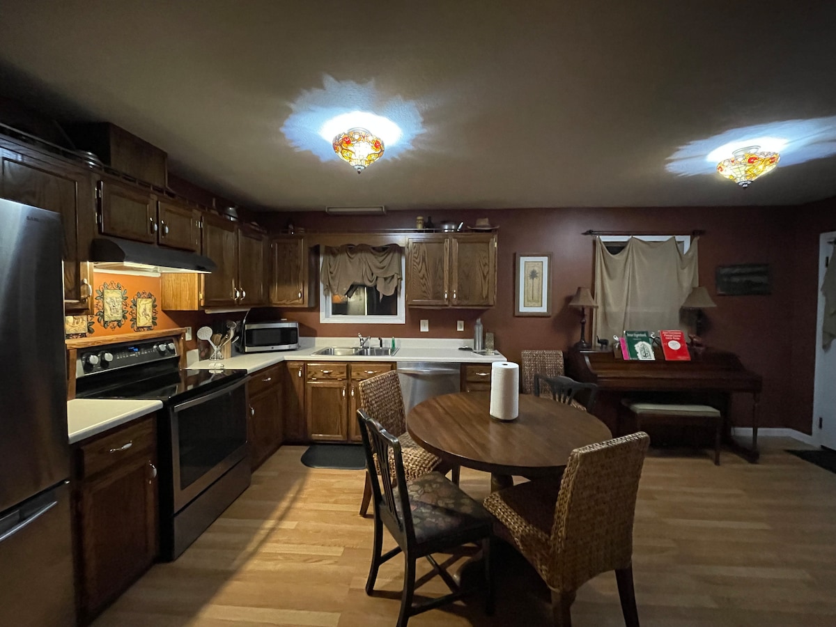 Entspanne dich mit Freunden oder Familie in diesem friedlichen, privaten Rückzugsort. Die Old Farmhouse Lodge ist ein großes, 2600 Quadratfuß großes, schönes Haus im Landhausstil mit einer großen Küche und einem Esszimmer sowie geräumigen, komfortablen Schlafzimmern. Das Anwesen selbst ist für Aktivitäten im Freien eingerichtet, indem es einen Ort zum Spielen von Softball oder anderen Spielen wie Hufeisen, Cornhole oder Wandern bietet. Entspannen Sie sich auf der Veranda oder rund um die Feuerstelle, Holz oder Gas. Bringen Sie Ihre Angelruten mit und angeln Sie im schönen, gefüllten Teich.