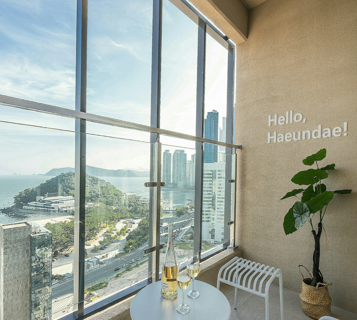 Terrasse mit Blick auf das schöne Haeundae Hochhaus Premier Meerblick / 1 Queensize-Bett + Schlafsofa + 2 Zimmer mit allen Optionen