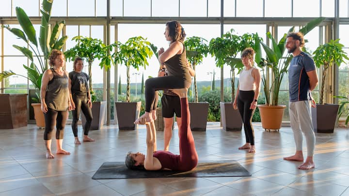 Kombiniere die Acroyoga-Praxis mit einem Yoga-Workshop deiner Wahl, einschließlich Yin Yoga, Power, Vinyasa, SUP Yoga, Hüftöffnung, Brustdehnung und -öffnung, Balance- und Umkehrhaltungen.